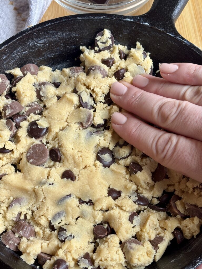 - Press the dough evenly into a skillet. Add extra chips, or chocolate chunks on top.