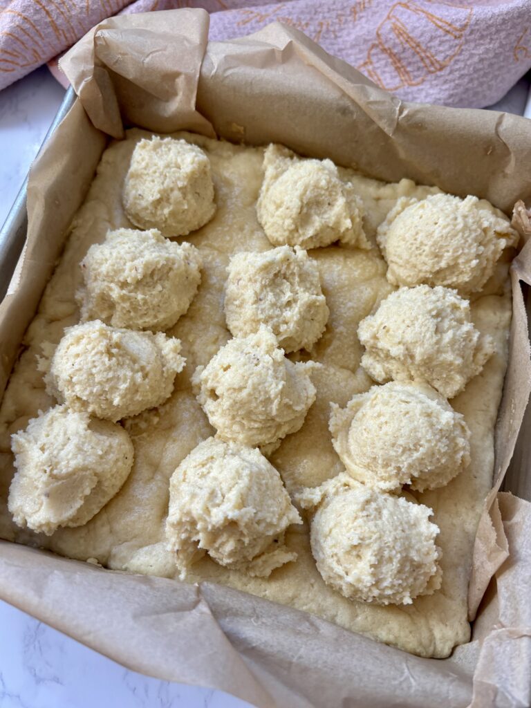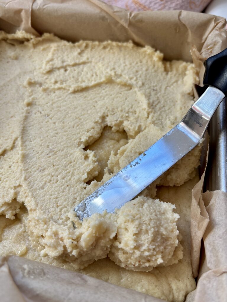 • Preheat oven to 375F and line a 8×8” baking pan with parchment paper.