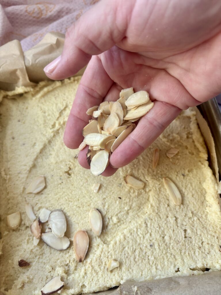 • Remove shortbread from oven and top with frangipane, spreading evenly. Sprinkle the top with sliced almonds.
