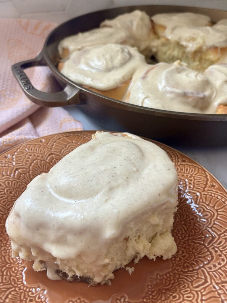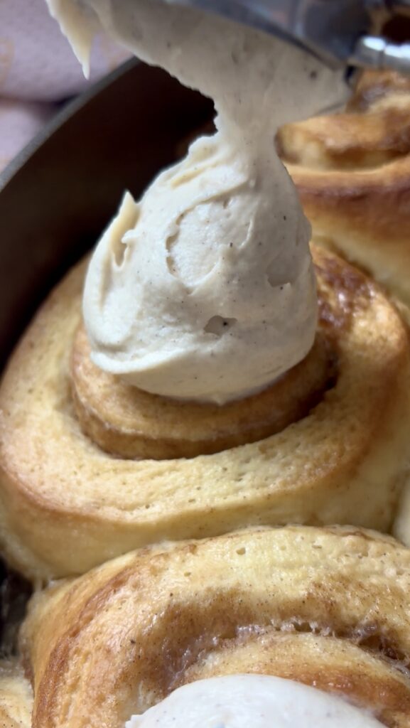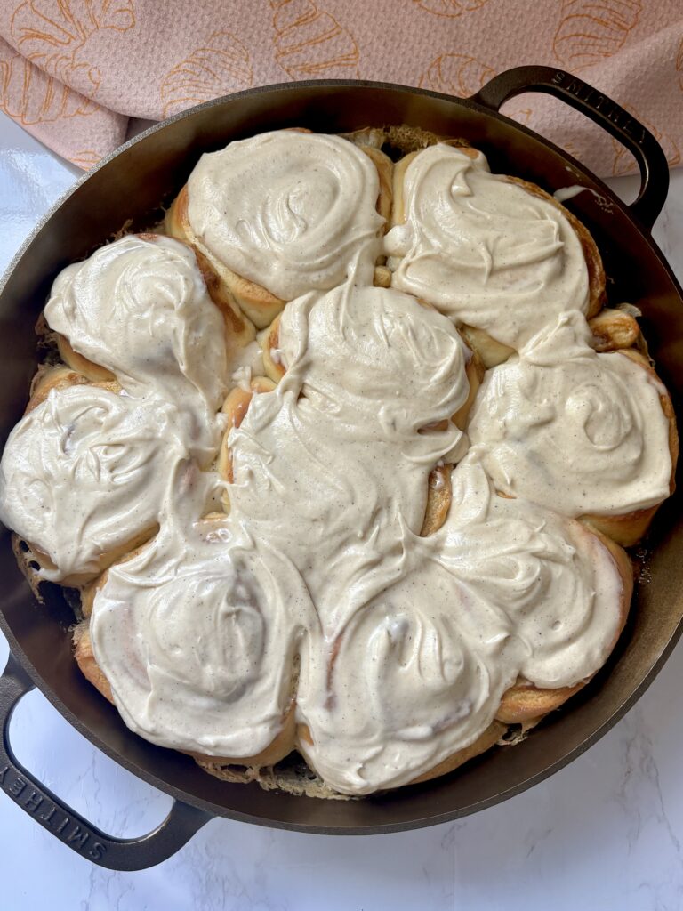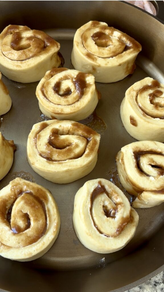 • Grease a 9×13” baking pan, or large cast iron skillet. Arrange cinnamon rolls in the pan or skillet. Cover and let rise another hour, or overnight in the fridge (although I don’t recommend letting them rise overnight in a cast iron skillet).