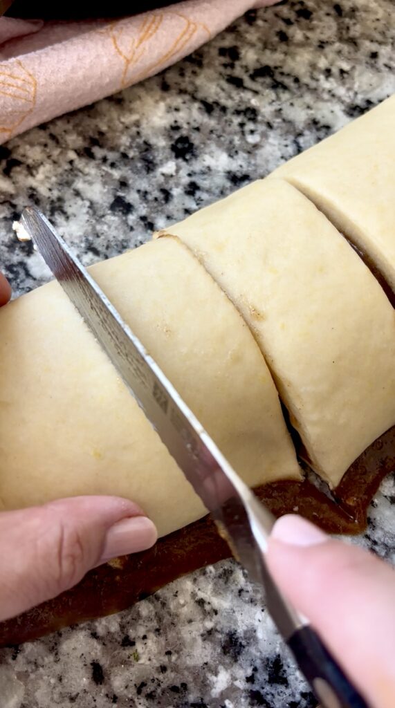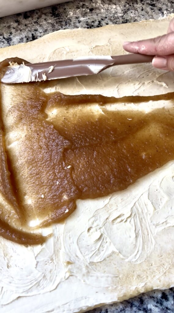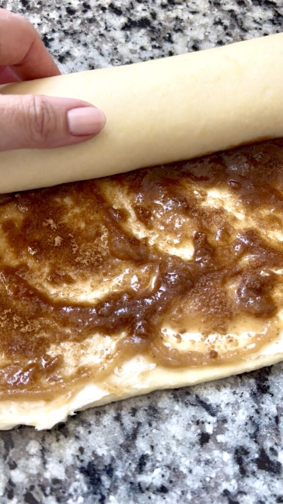• Lightly flour a work surface and turn out the dough. Roll gently into a 12×17” rectangle. Spread with 6 tbsp of softened butter, then spread the apple butter (leaving about 1 inch at the borders free), and then sprinkle on cinnamon sugar. Roll dough up starting at the long end. (This part gets messy because of the apple butter— but it is SO worth it!)
