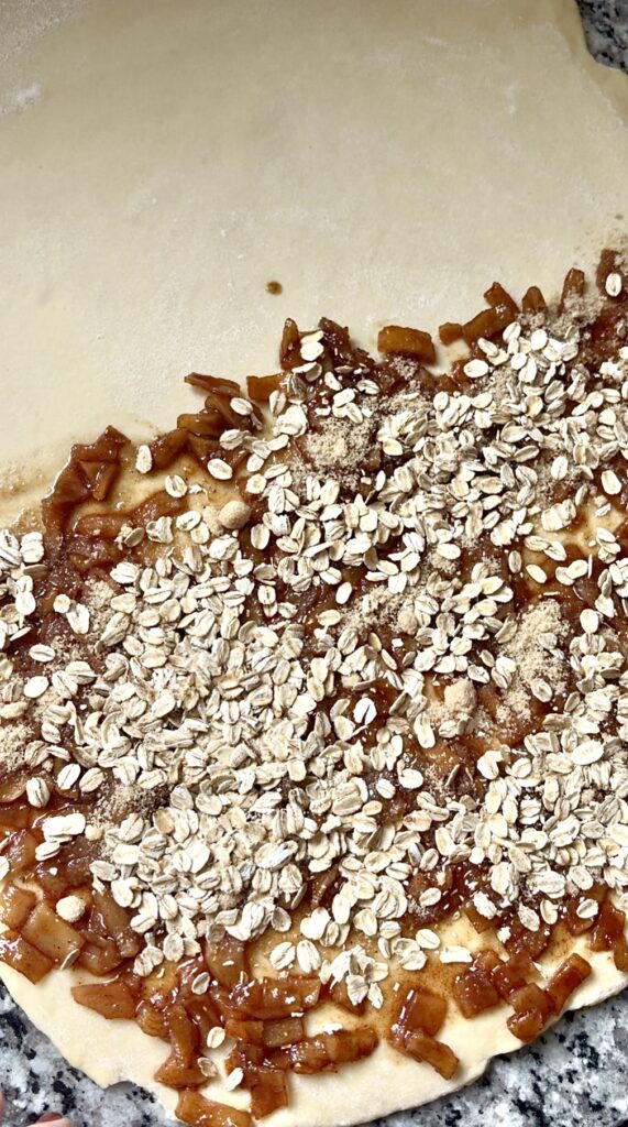 - The day of baking. On a lightly floured surface, roll the chilled dough into a 13×16-inch rectangle. Spread a layer of apple jam evenly over one half (the short end) of the dough. Sprinkle the oats evenly over the jam.