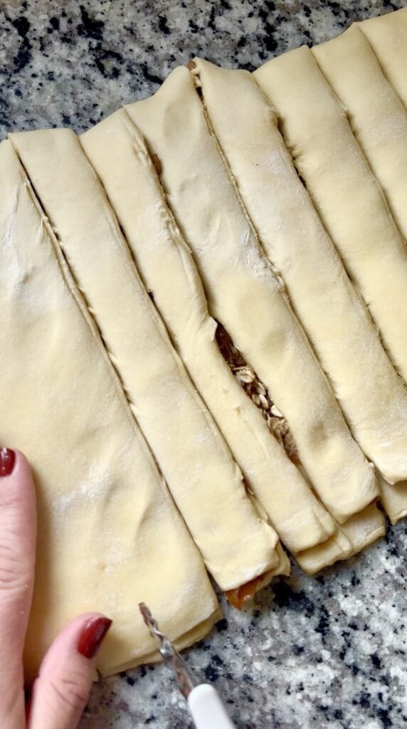 - Fold the dough in half to cover the filling (short ends meet), then use a sharp knife or pizza cutter to cut the dough into 12 even strips. Twist each strip a few times, then roll each twisted strip into a spiral shape and place into a greased or parchment-lined muffin tin.