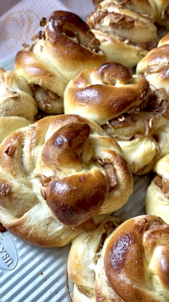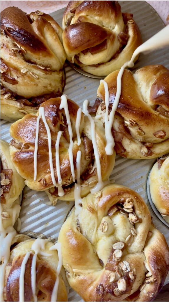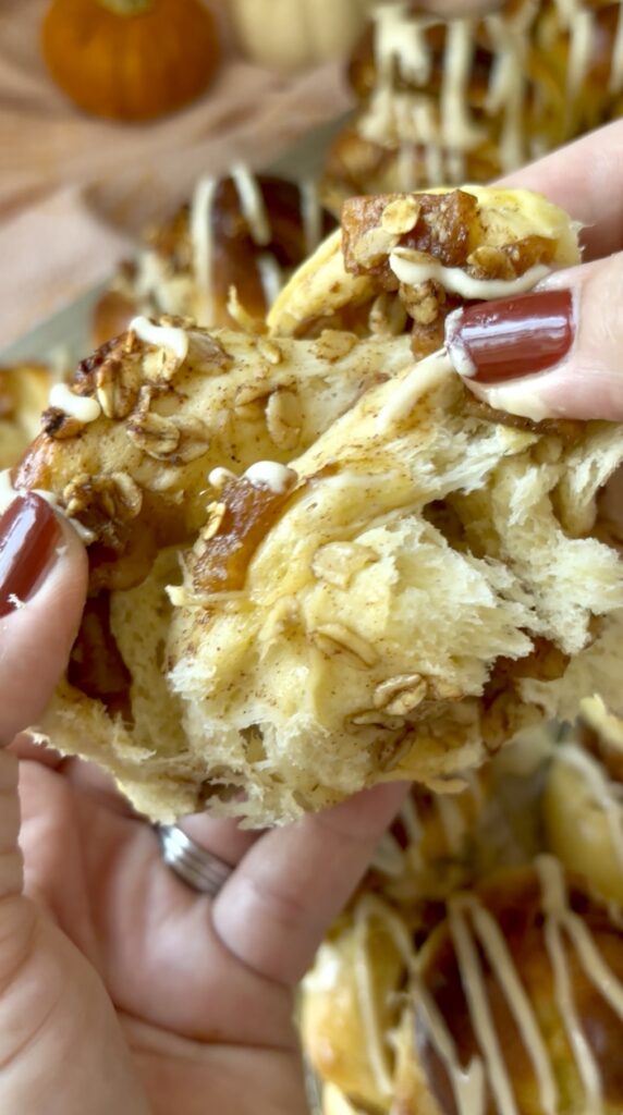 The pillowy brioche dough is layered with a cinnamon apple filling made from real apples, brown sugar, oats, and a hint of pumpkin spice, then twisted into beautiful rolls and baked until golden.