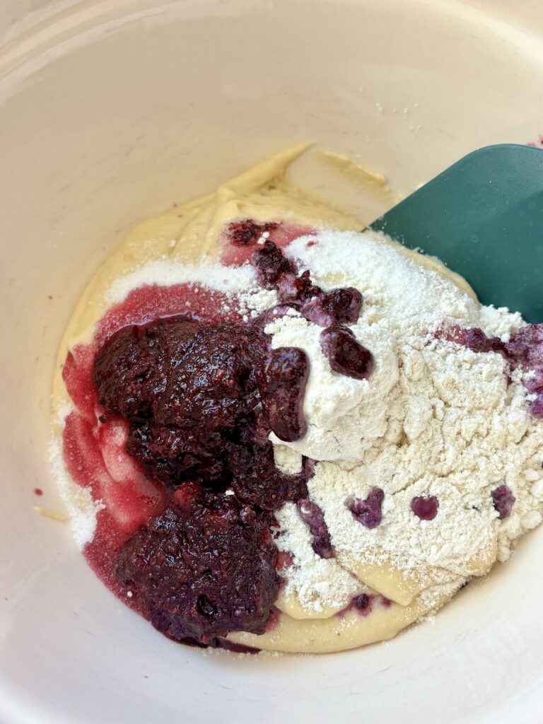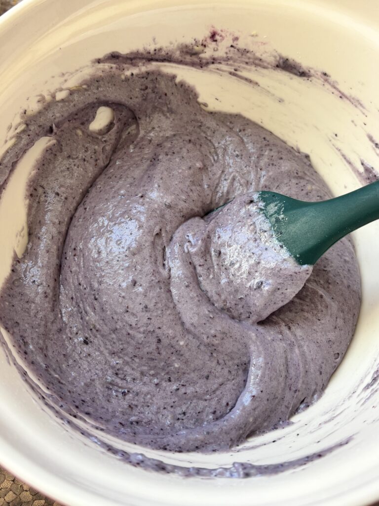 • Remove about ⅓ of the batter to a separate bowl. Stir in crushed blueberries, sugar, and flour until smooth.