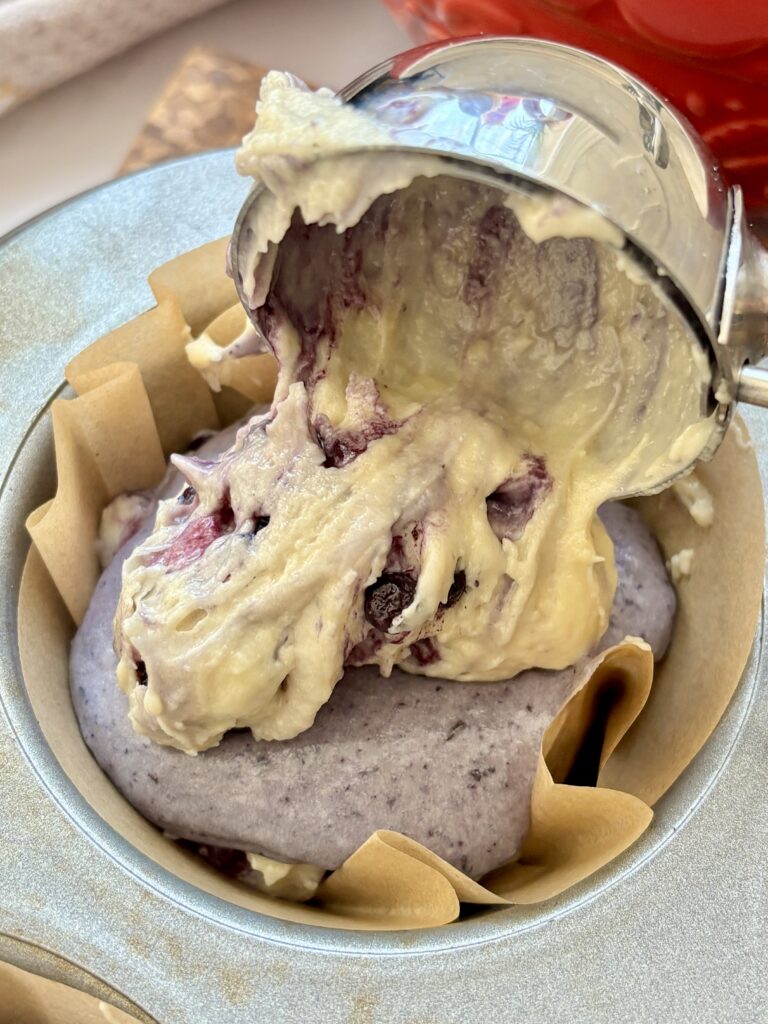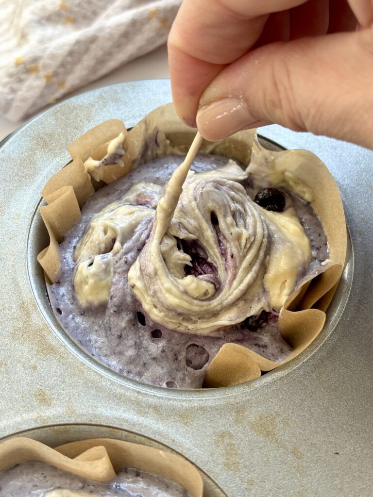 • Spoon plain batter into muffin wells, filling about ⅔ full. Add small spoonfuls of blueberry batter, then top with more plain batter. Gently swirl with a toothpick or skewer.