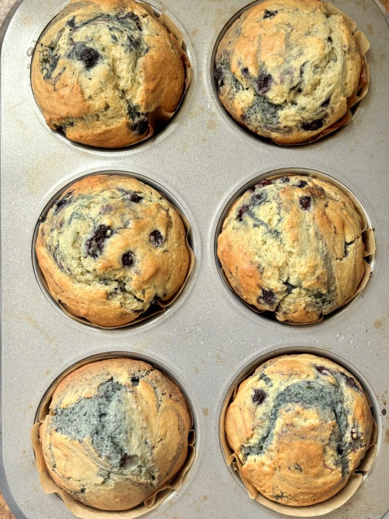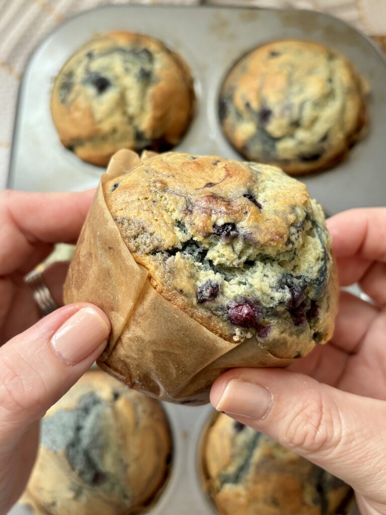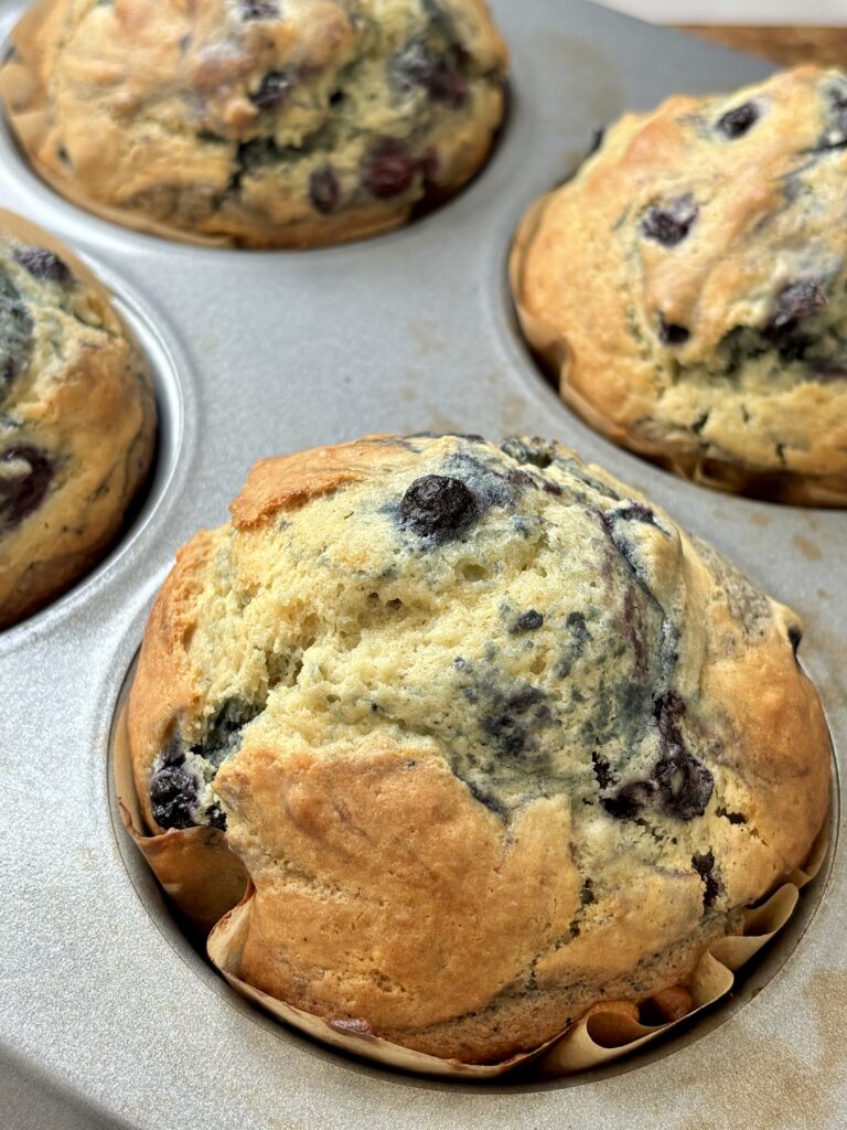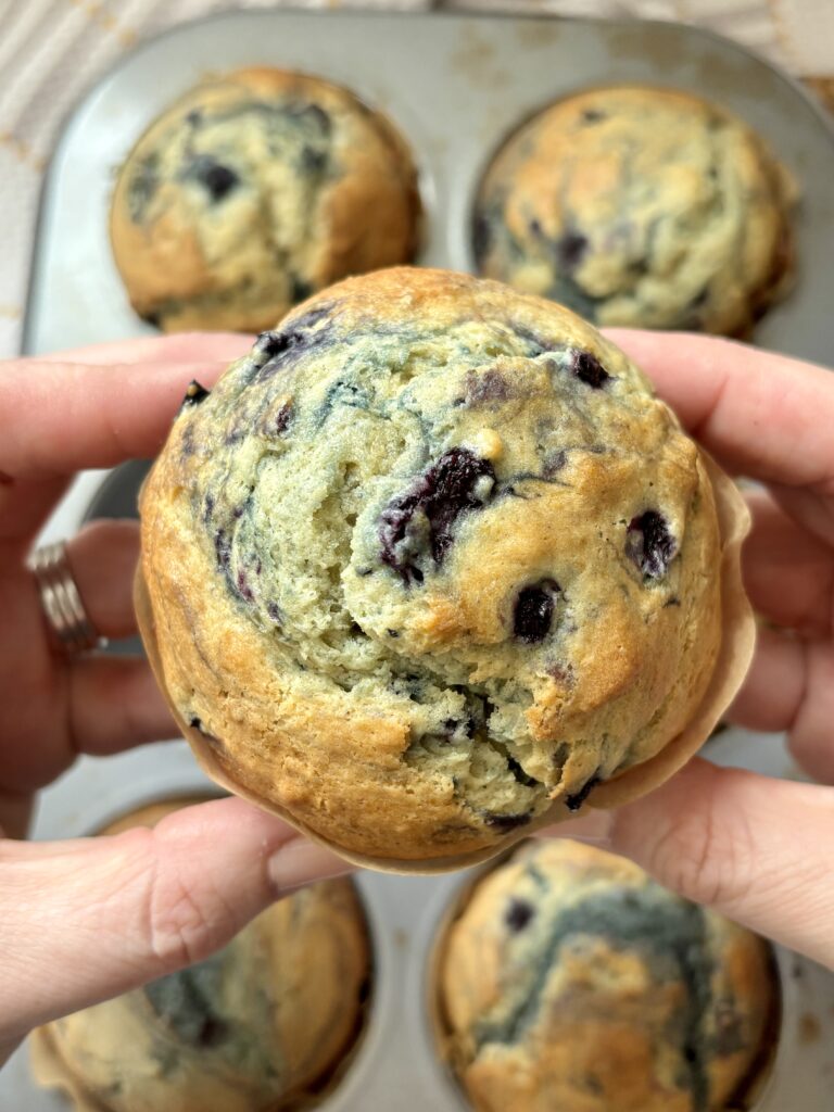 Yes, fresh blueberries work beautifully in this recipe. Rinse and dry them thoroughly first so extra moisture doesn’t thin the batter. Lightly toss the berries in flour before folding them into the muffin batter, this helps them stay evenly distributed instead of sinking to the bottom.