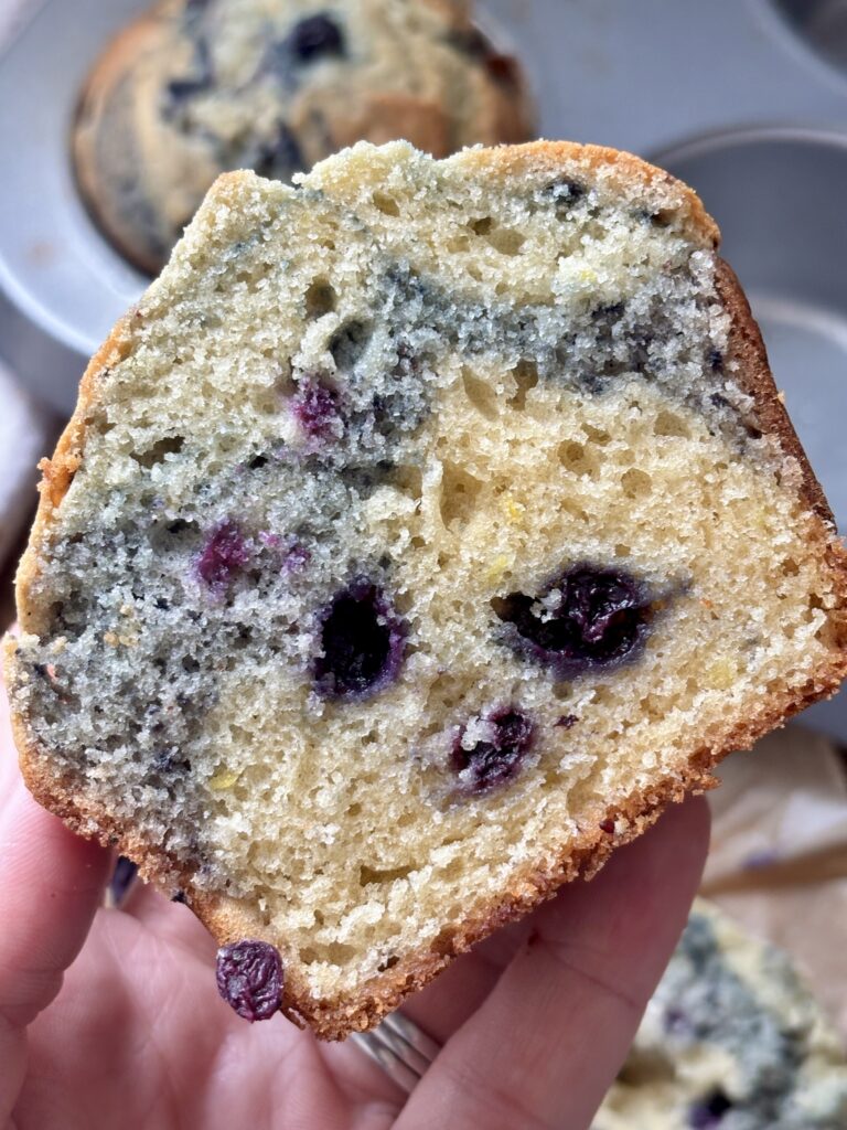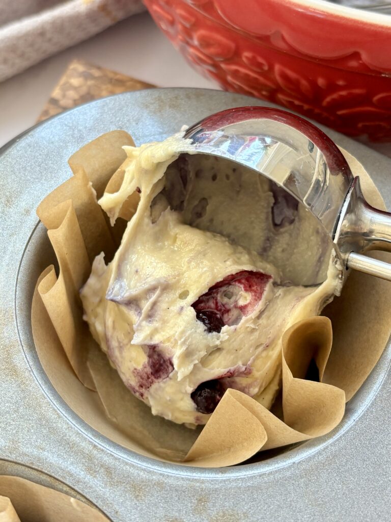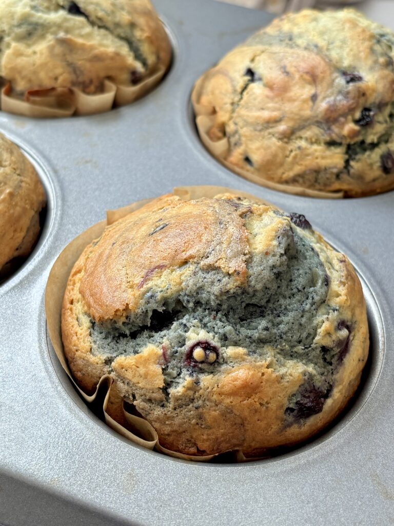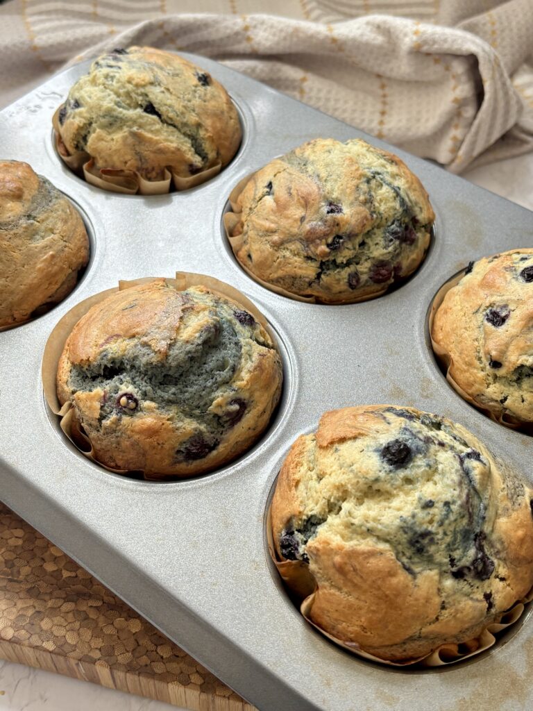 Yes, fresh blueberries work beautifully in this recipe. Rinse and dry them thoroughly first so extra moisture doesn’t thin the batter. Lightly toss the berries in flour before folding them into the muffin batter, this helps them stay evenly distributed instead of sinking to the bottom.