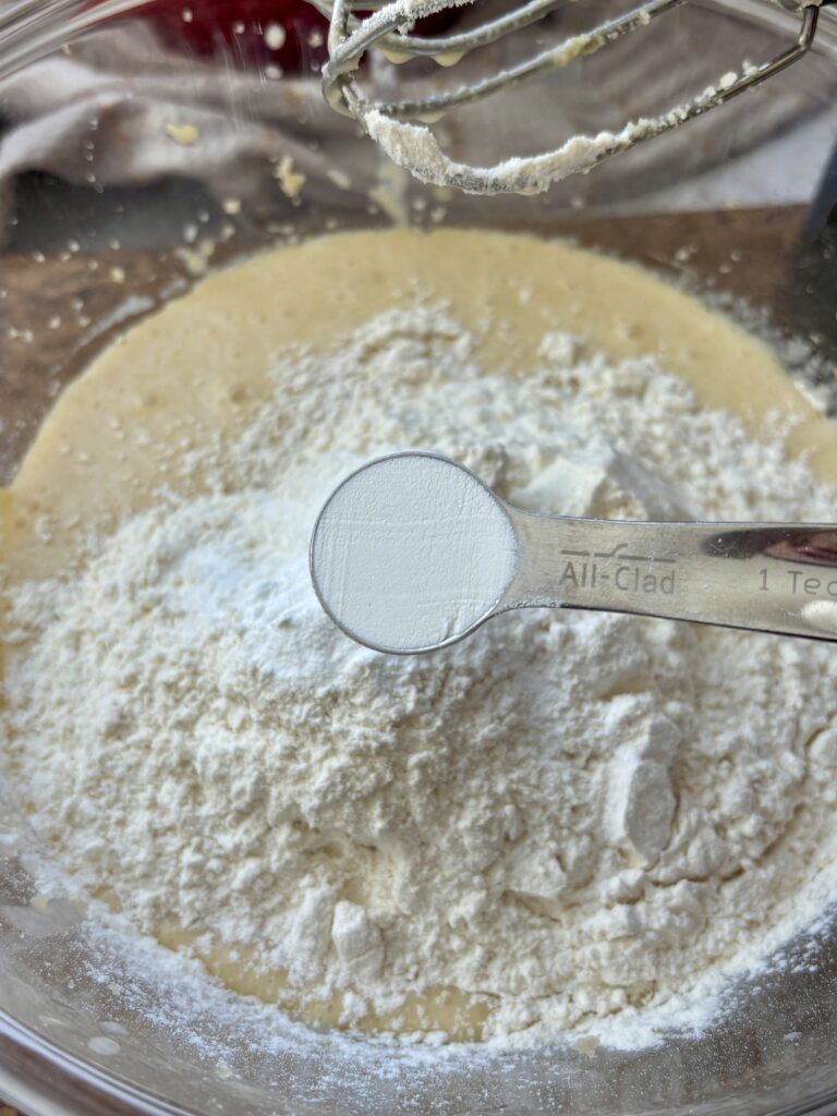 • Add flour, baking powder, baking soda, and salt. Mix just until combined.