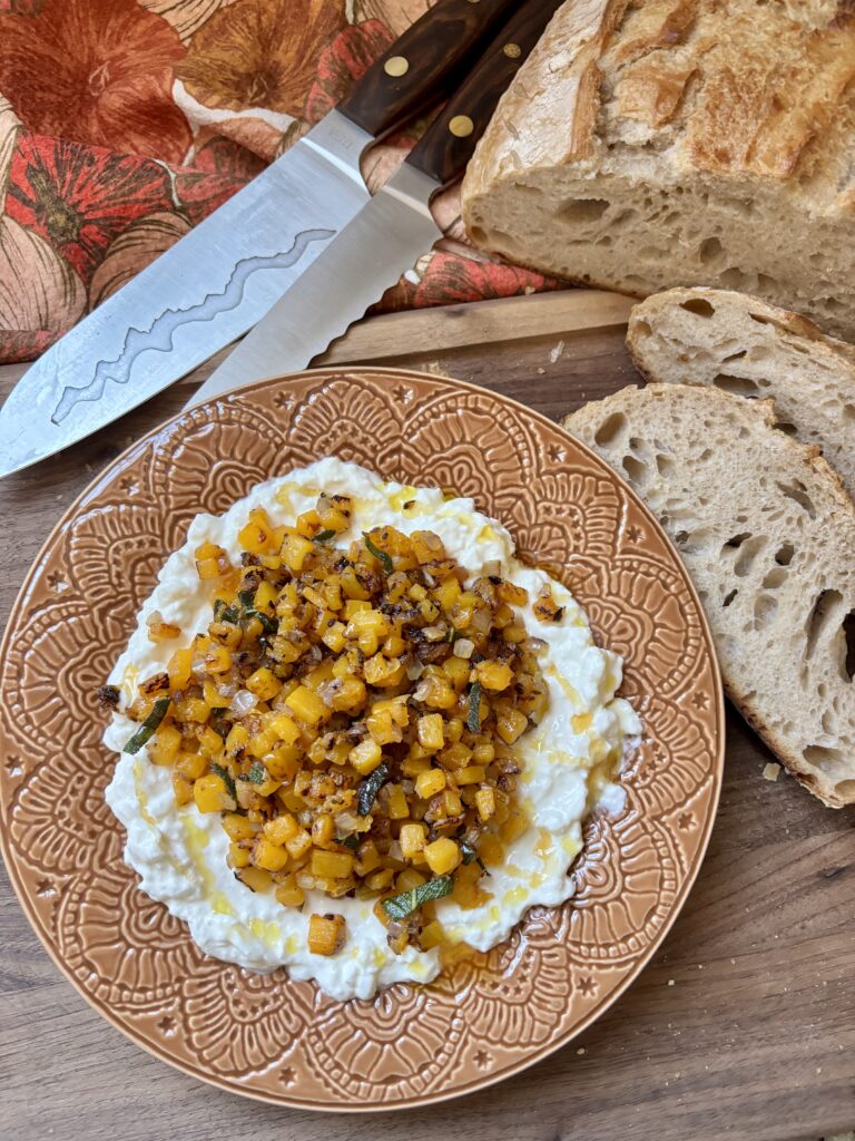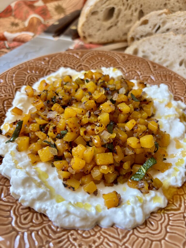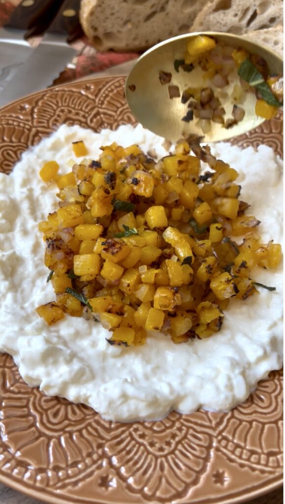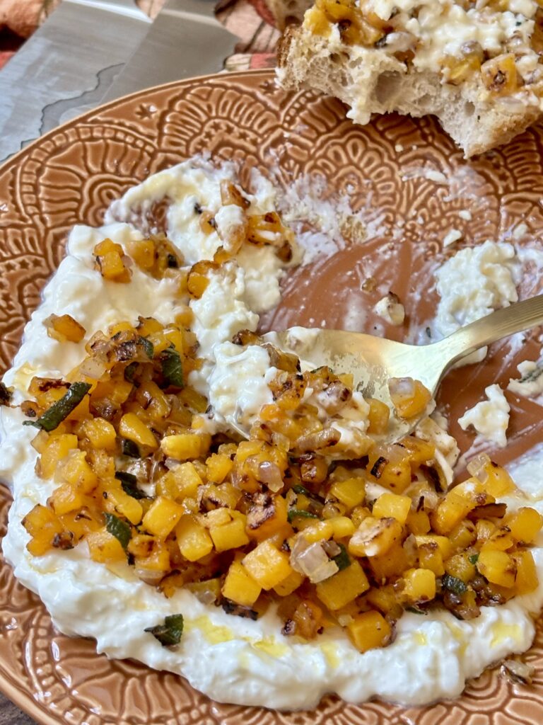 This easy Butternut Squash Bruschetta with Stracciatella is the perfect balance of cozy, creamy, and crave-worthy. Sweet sautéed butternut squash meets fragrant sage and caramelized red onion. It is served over luscious and creamy Stracciatella cheese — all finished with a drizzle of olive oil and hot honey. Served with toasted crusty bread or crackers, it’s the kind of appetizer that looks impressive but comes together in minutes.