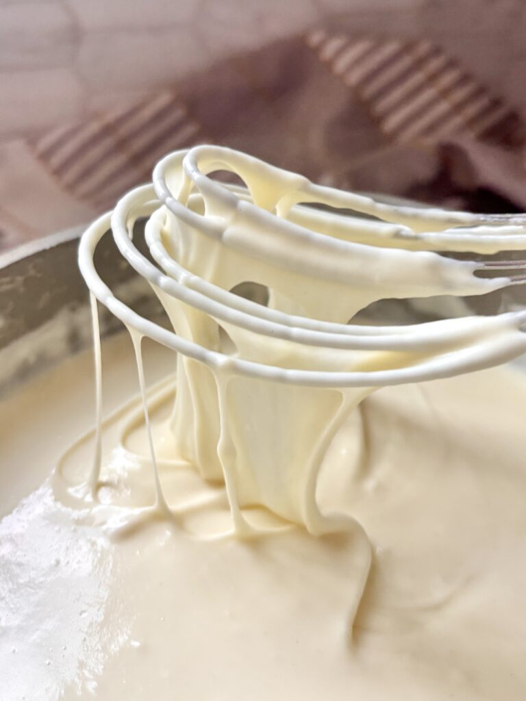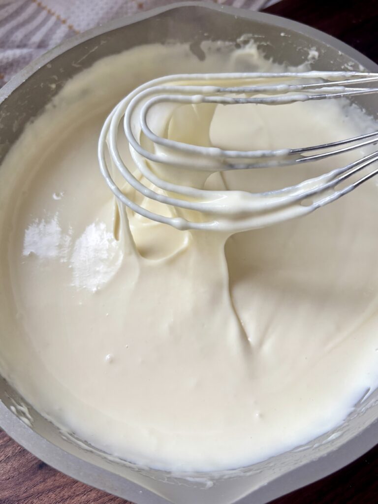 - Slowly whisk in the warm heavy cream until completely smooth.