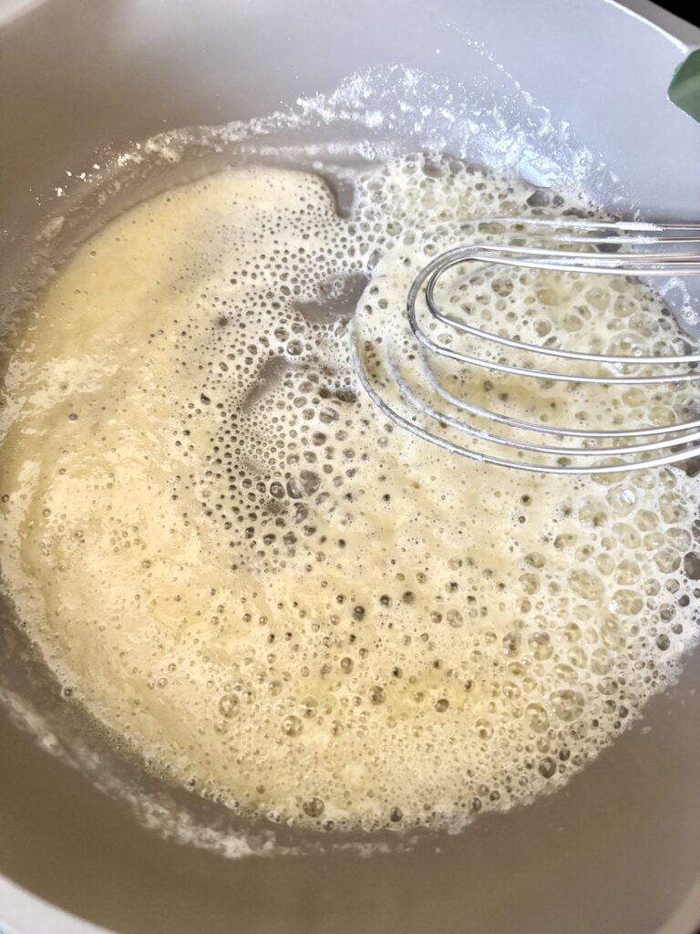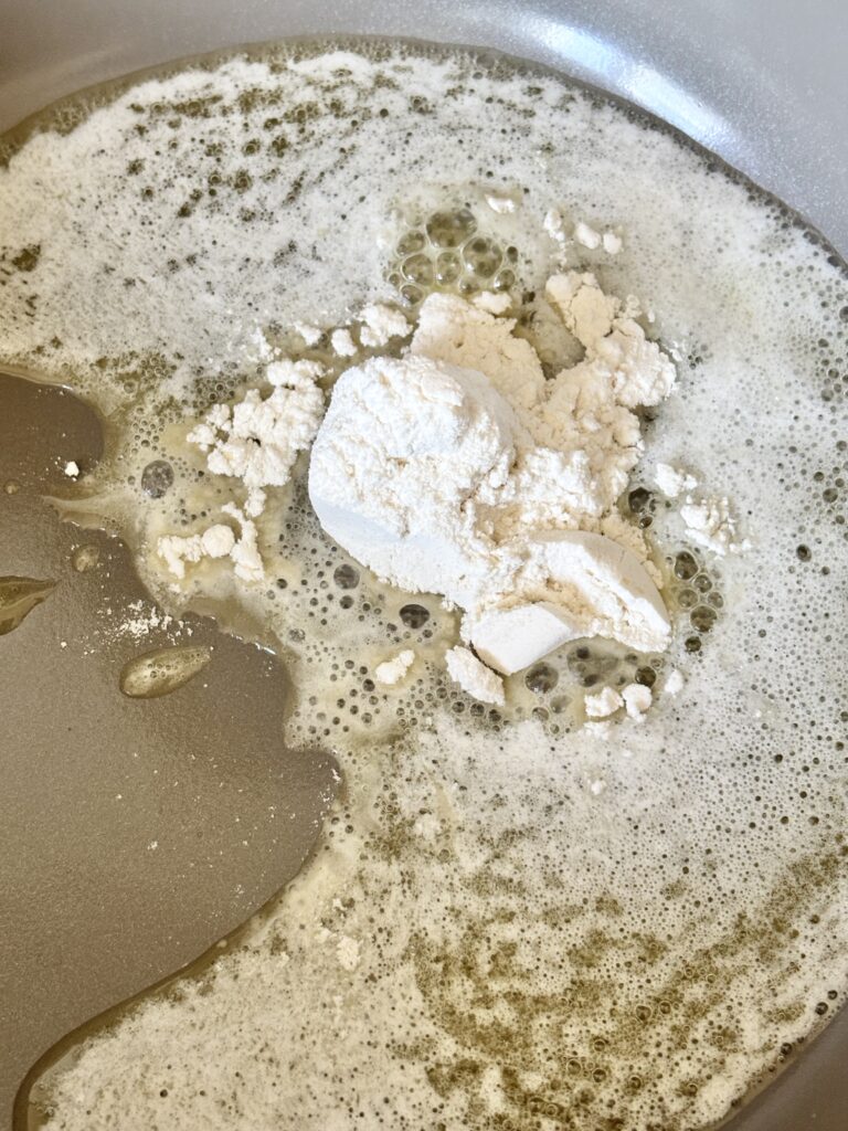 - Whisk in the flour and cook for about 1 minute, until smooth and lightly bubbling (do not brown).