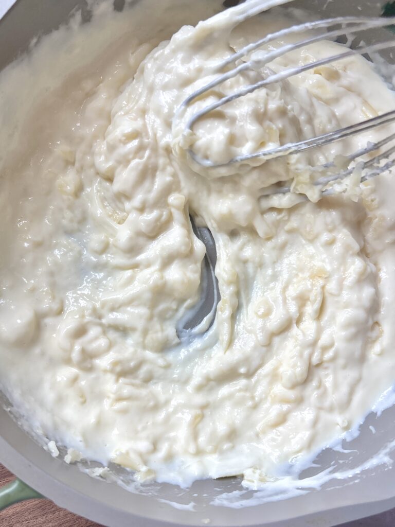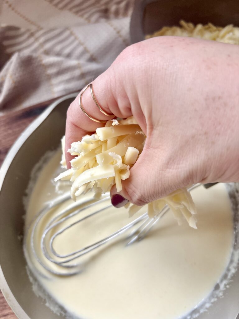 - Remove from heat. Add the cheeses gradually, stirring until fully melted and smooth.