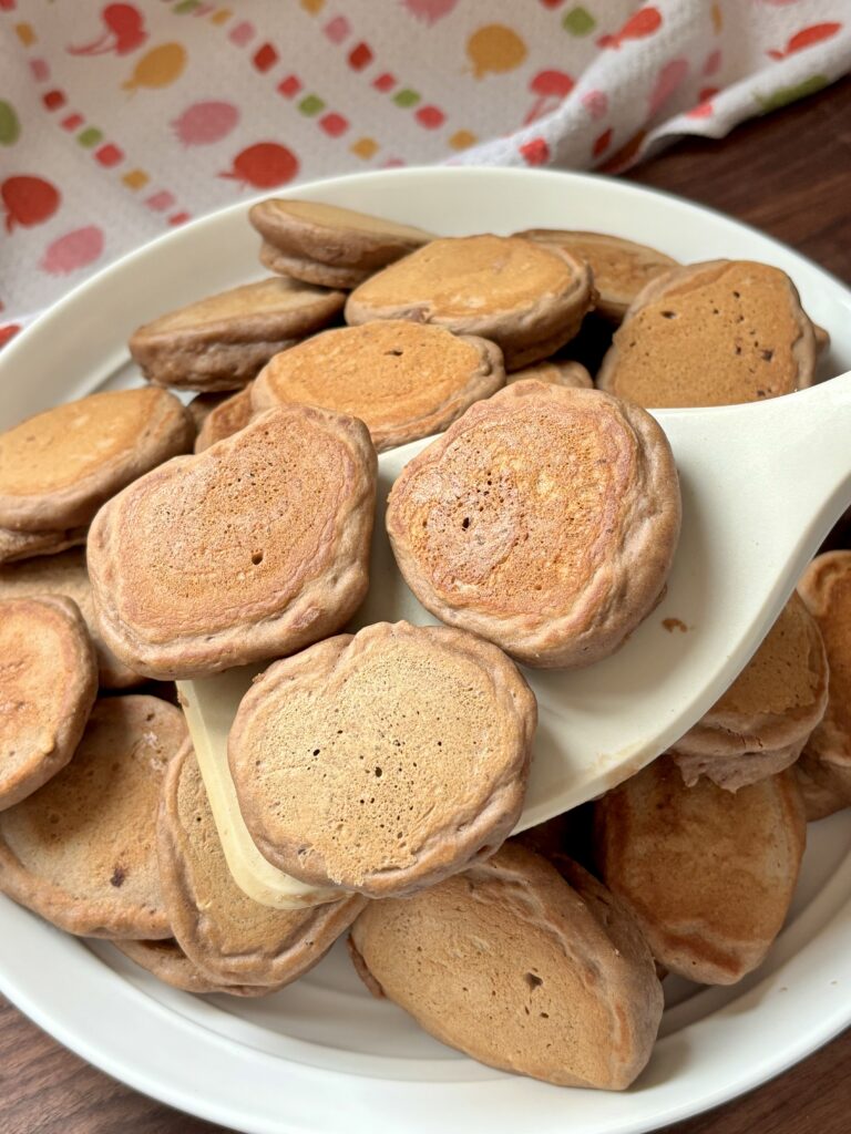 • Use a size 60 scoop or 1 tablespoon for consistent dipper size. Even sizing ensures the pancakes cook at the same rate and gives you perfectly dippable, bite sized pieces that are easy to serve and fun to eat.