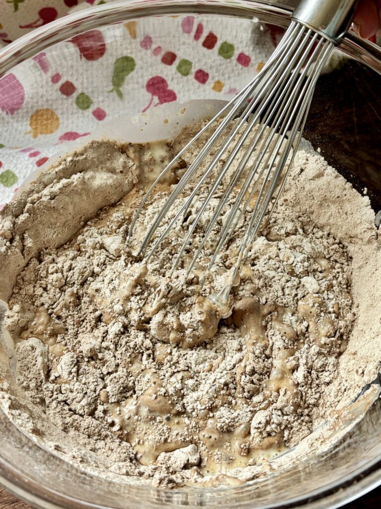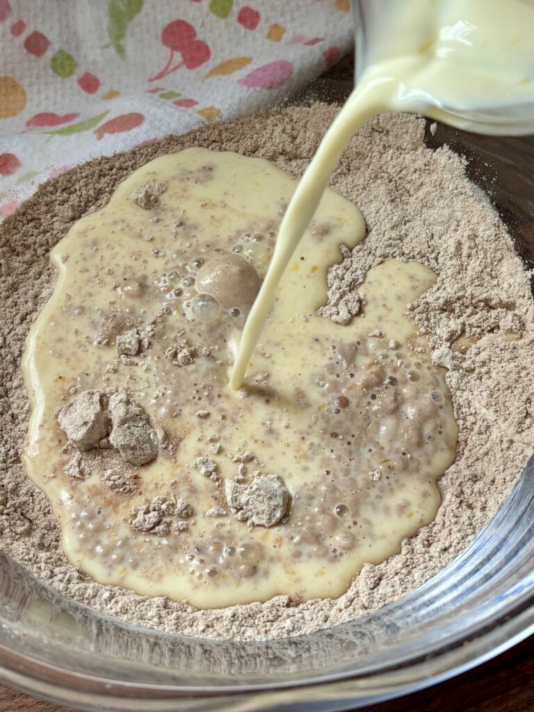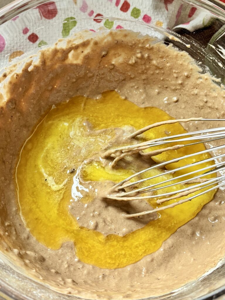 • Pour the wet mixture into the dry ingredients. Mix together. Add melted butter and 2 tablespoons of water. Stir until just combined, adding more water as needed for a thick but pourable batter.