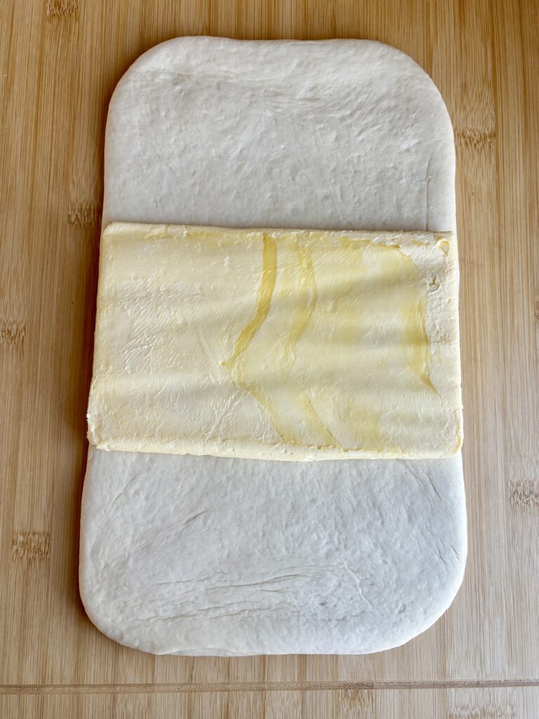 - Roll chilled dough into an 8½x12-inch rectangle. Place butter in the center and fold dough over to fully enclose. Seal edges.