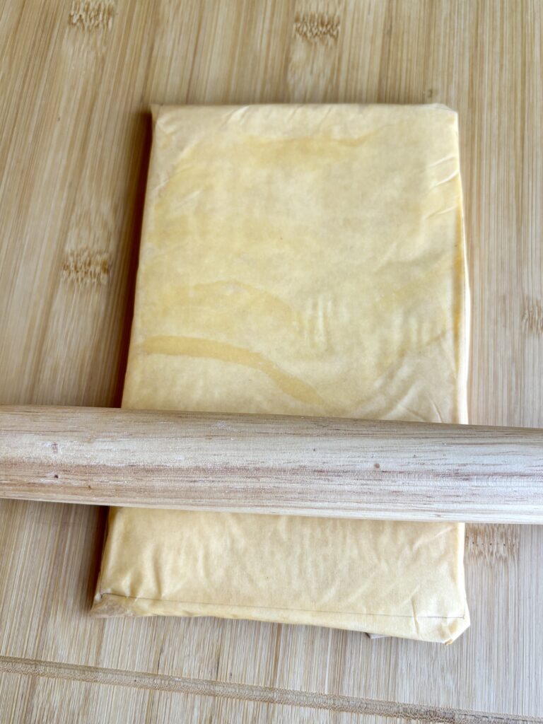 - Chill until firm but pliable. Butter should match the consistency of the dough. (If it is alittle too firm when removing from the fridge, use the rolling pin to gently pound it to soften it up)