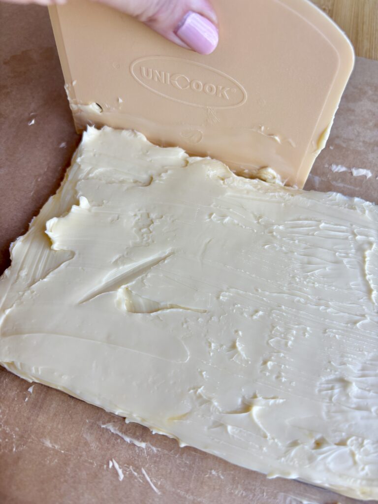 - Place butter between parchment paper and pound or roll into an 8×5-inch rectangle (making sure it all sticks are well combined).