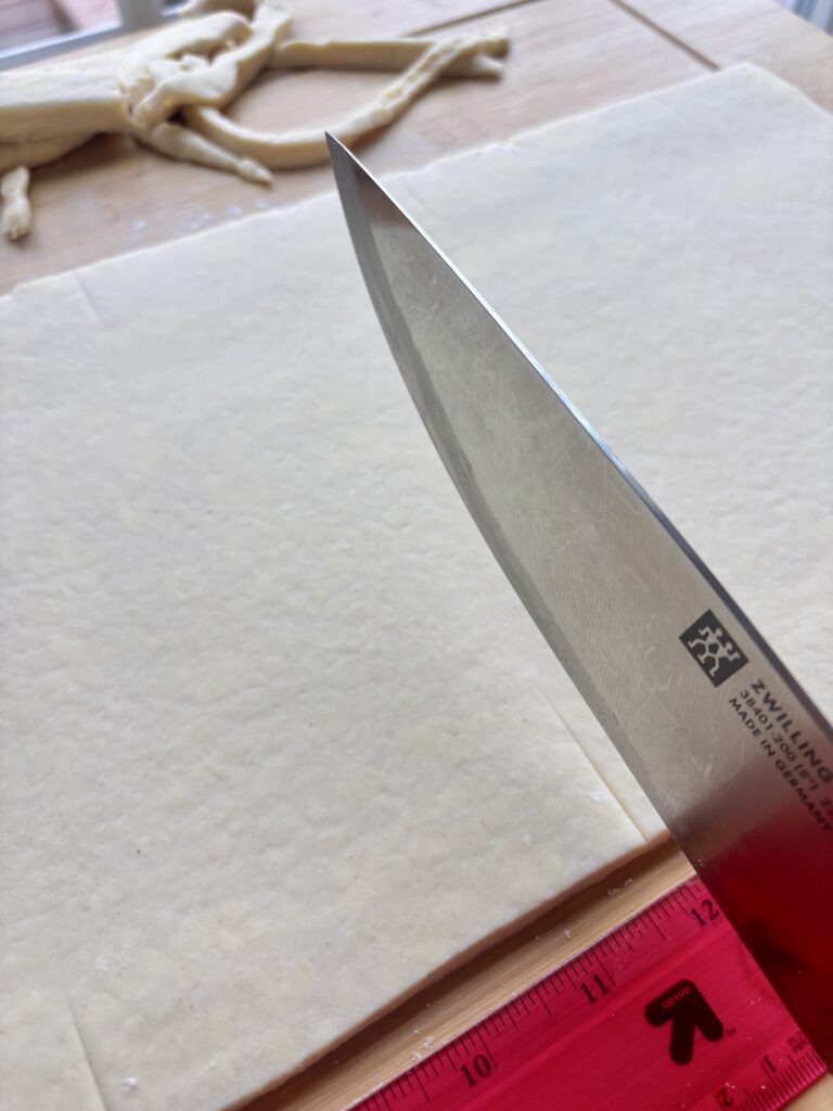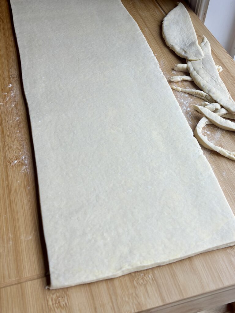 - Roll dough into a 10×24-inch rectangle, about ⅛-inch thick. Trim edges.
