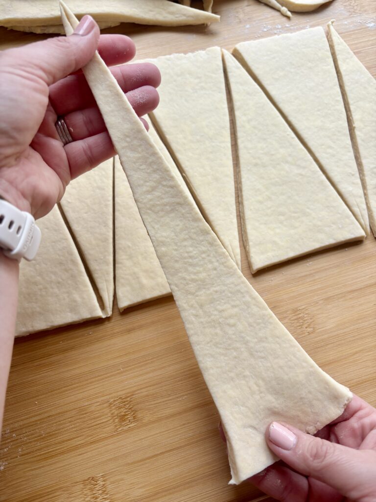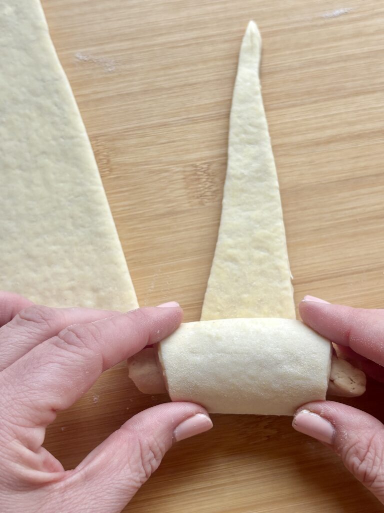 - Gently stretch each triangle, then roll from base to tip. Curve ends slightly inward.