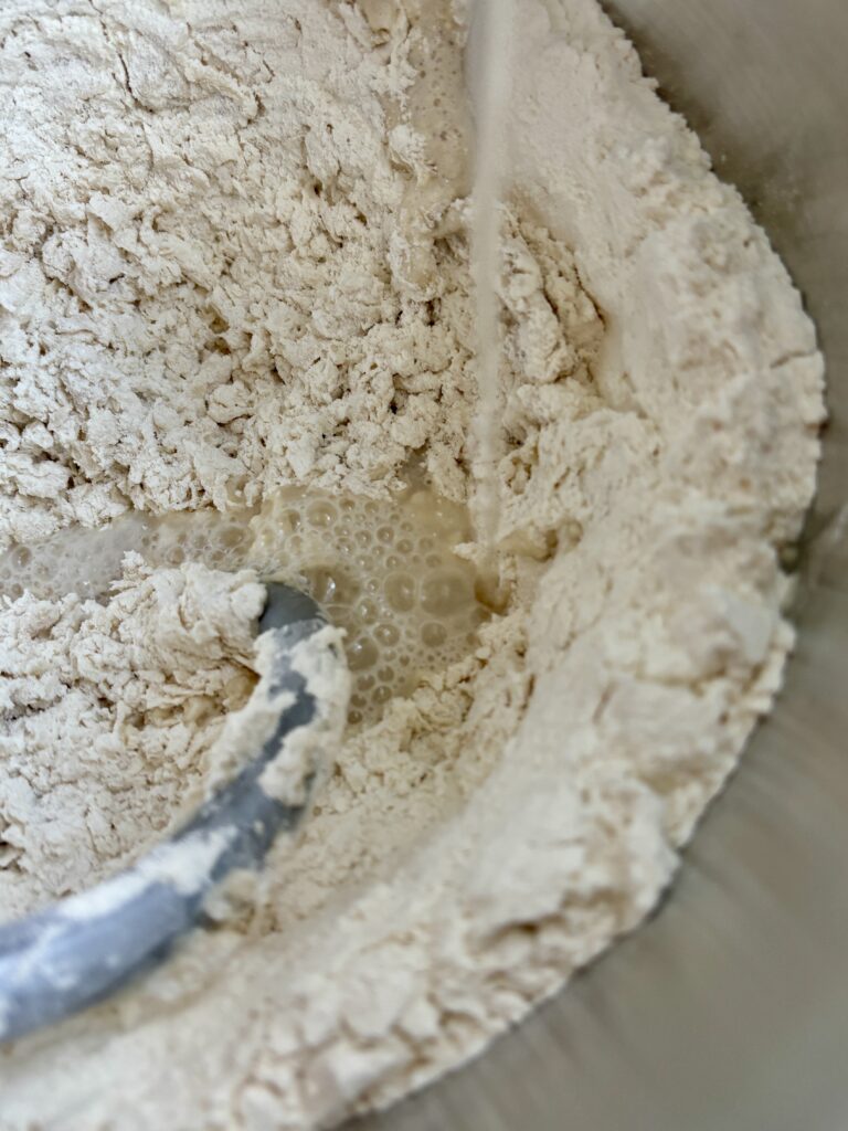 - Add yeast mixture and cold water. Mix until a shaggy dough forms.