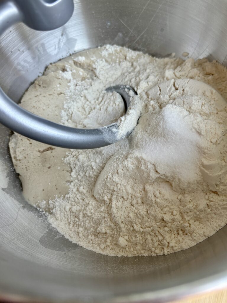 - In a stand mixer bowl, combine bread flour, all-purpose flour, and salt.