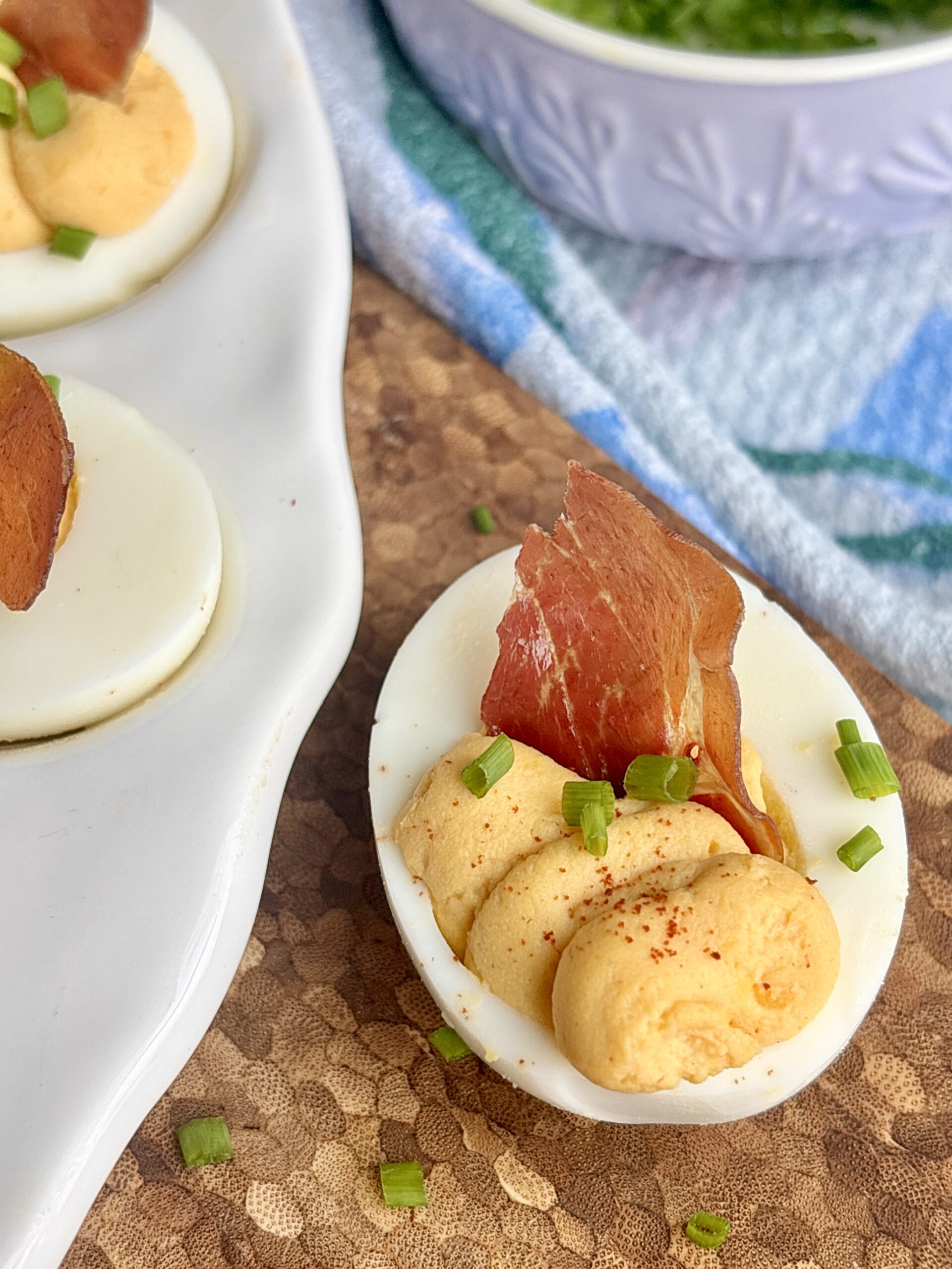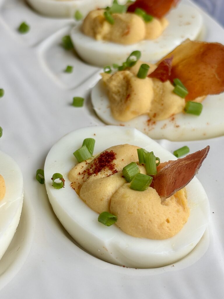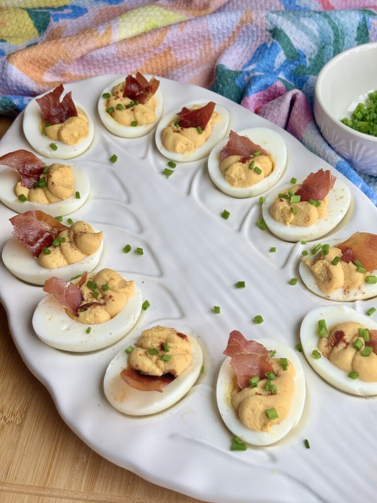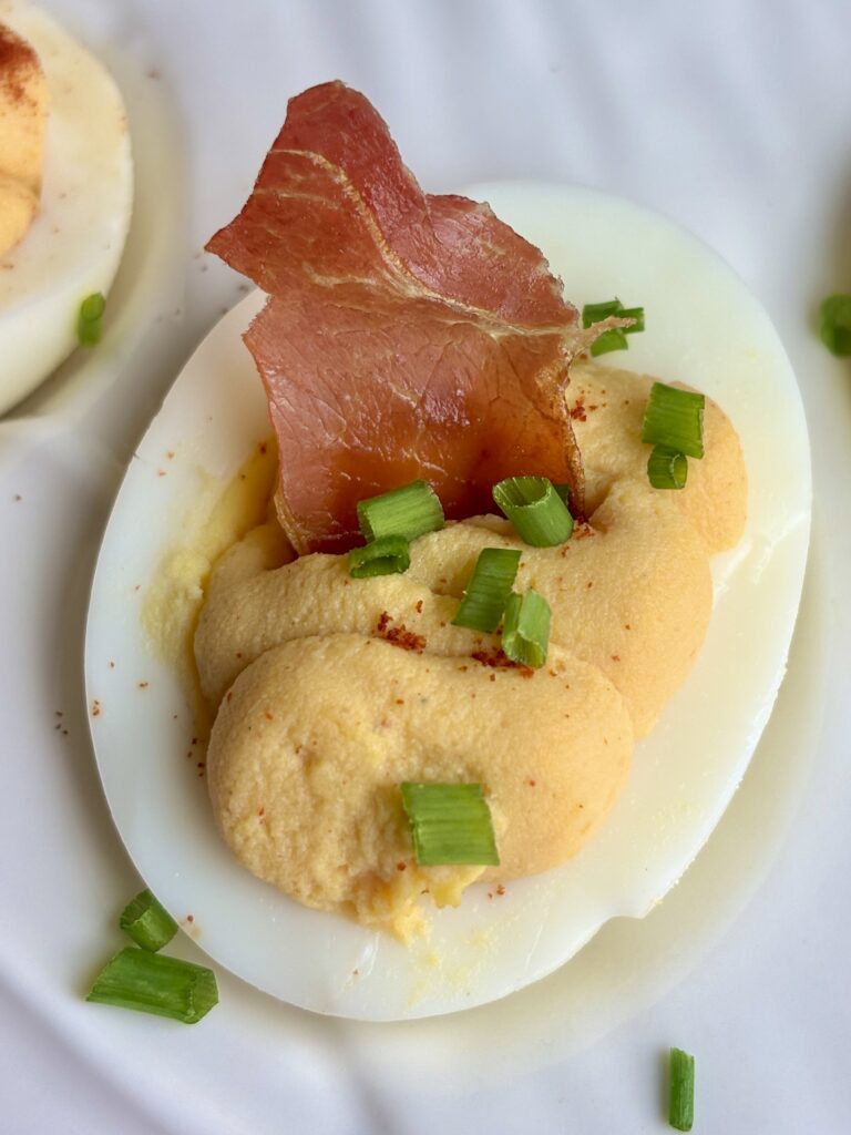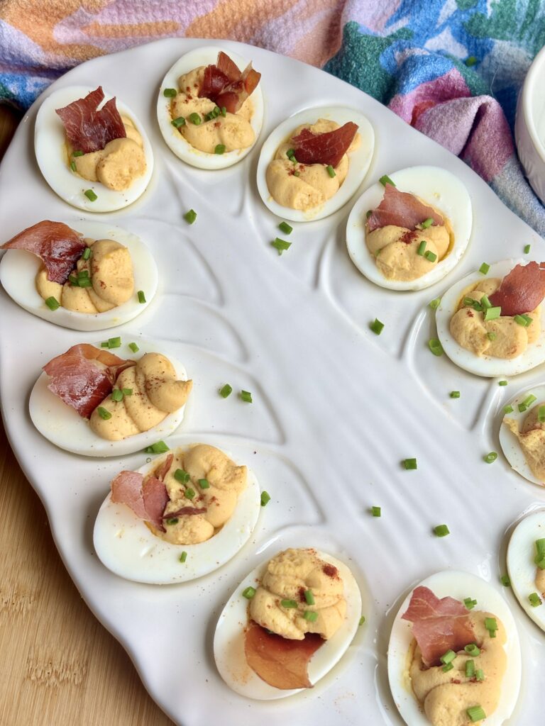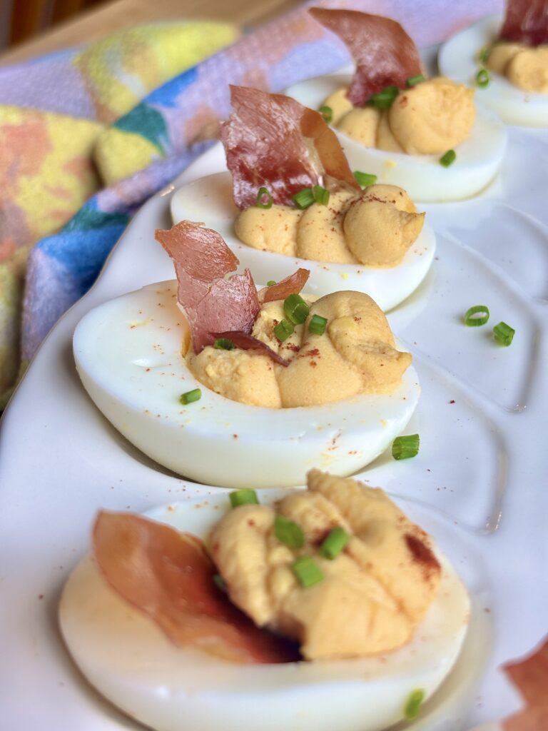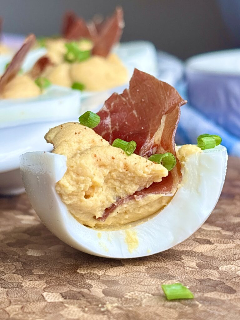 The filling is smooth and flavorful with just the right amount of tang from Dijon and banana pepper (or pickle) juice, while a subtle splash of Worcestershire sauce adds an unexpected umami depth that really sets these apart. Then comes the star, crispy prosciutto! It adds texture, crunch, and a savory bite that pairs perfectly with the creamy yolk filling.