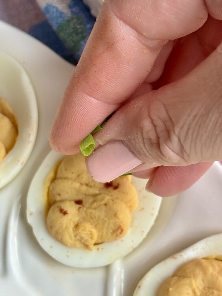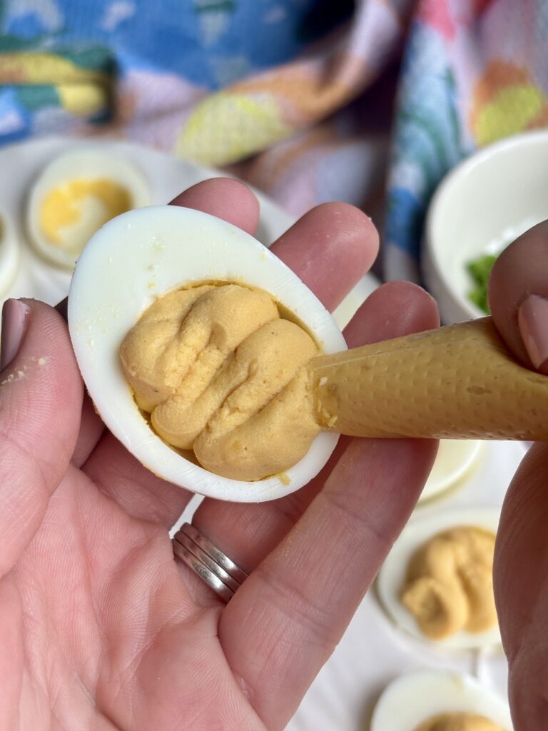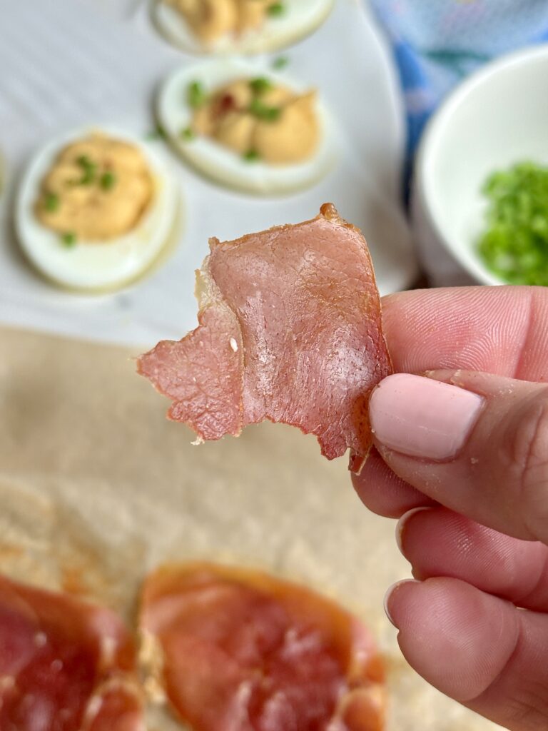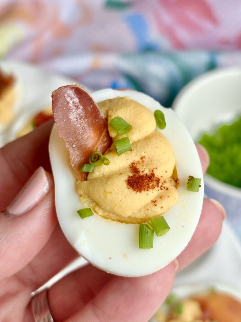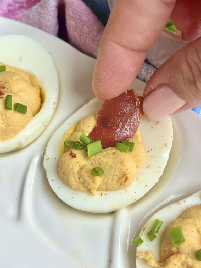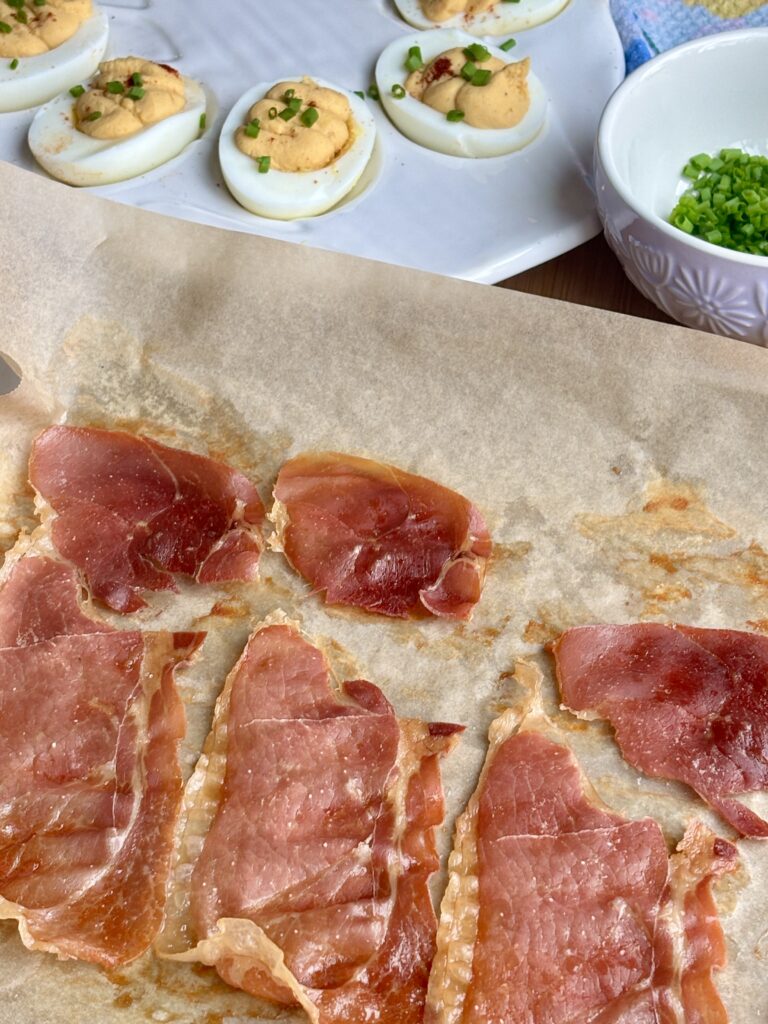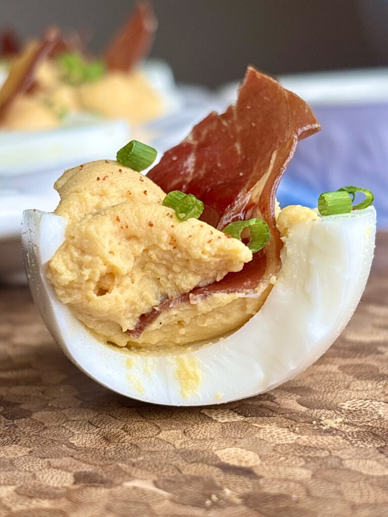 The filling is smooth and flavorful with just the right amount of tang from Dijon and banana pepper (or pickle) juice, while a subtle splash of Worcestershire sauce adds an unexpected umami depth that really sets these apart. Then comes the star, crispy prosciutto! It adds texture, crunch, and a savory bite that pairs perfectly with the creamy yolk filling.