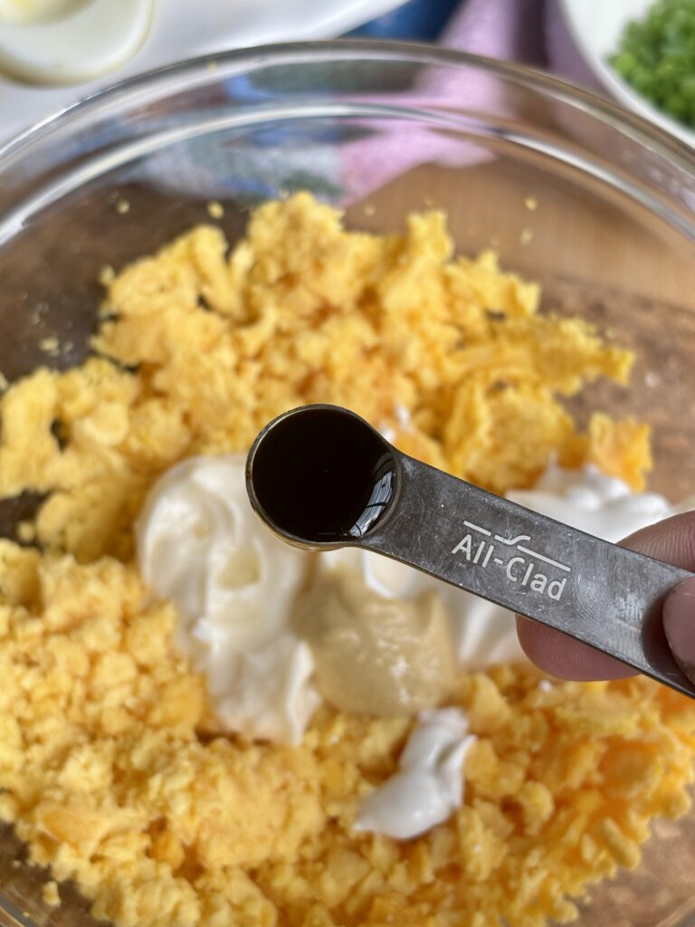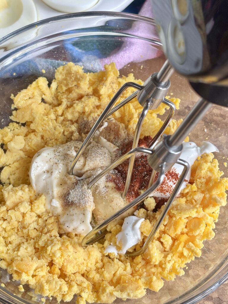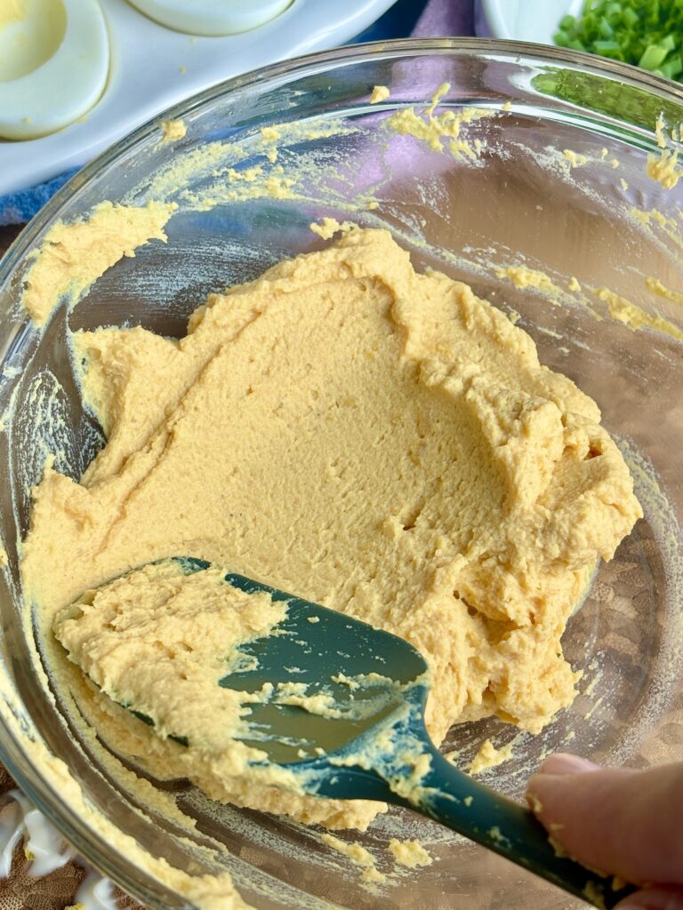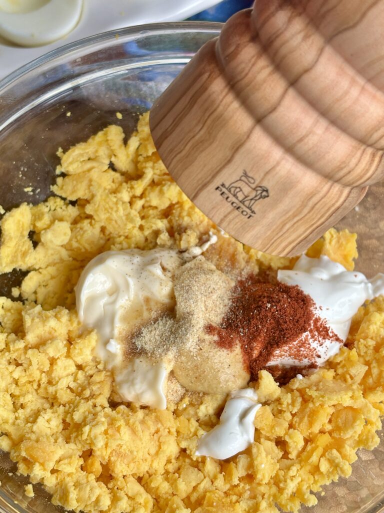 - Mash yolks until smooth. Add mayonnaise, sour cream, Dijon, banana pepper juice, Worcestershire sauce, garlic powder, smoked paprika, and cayenne (if using). Mix until creamy.
