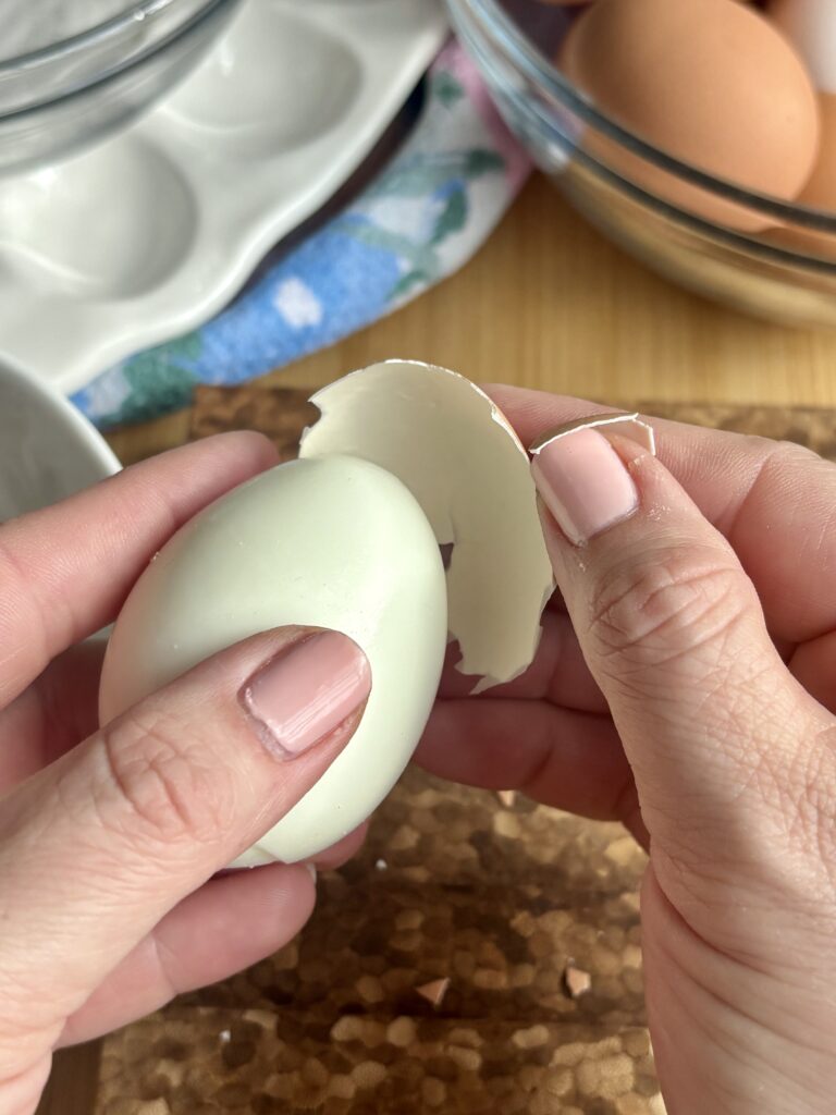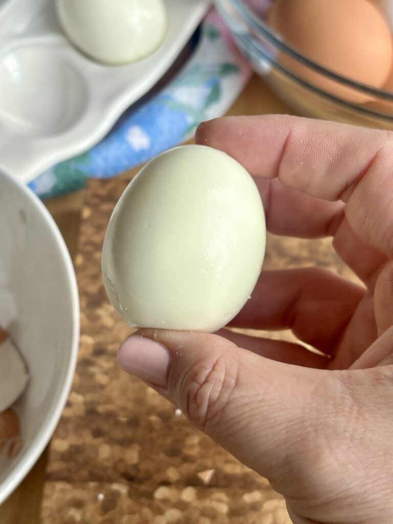 If you’re still having trouble, try gently cracking the shell all over and peeling under running water. The water helps get between the shell and membrane, allowing it to slide off more easily.