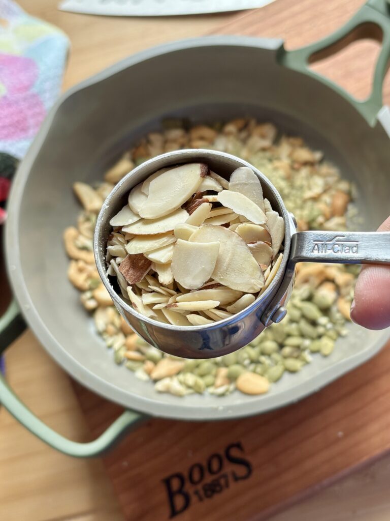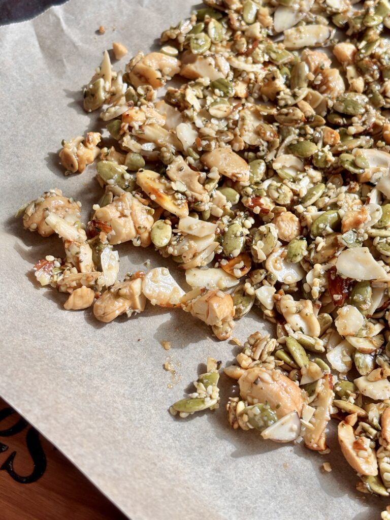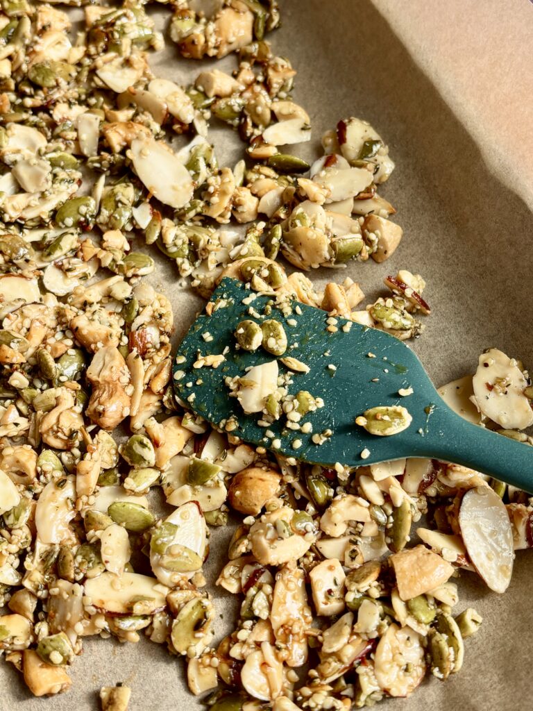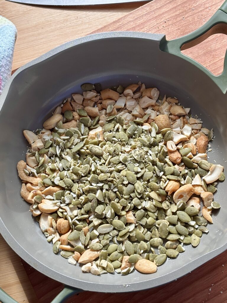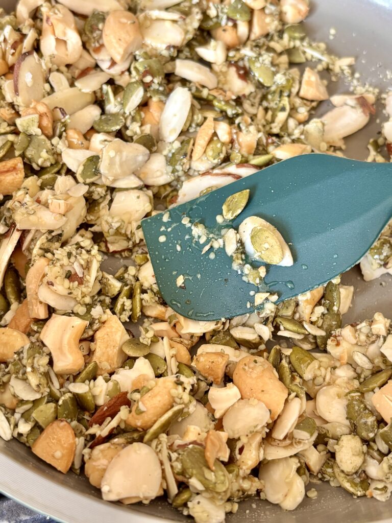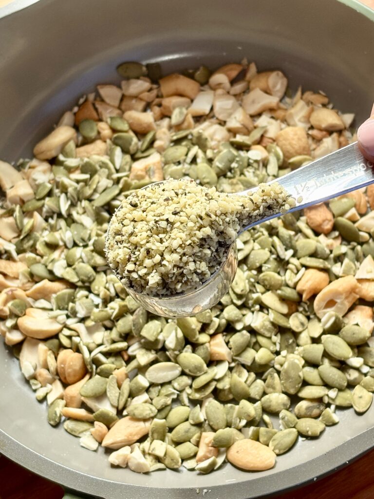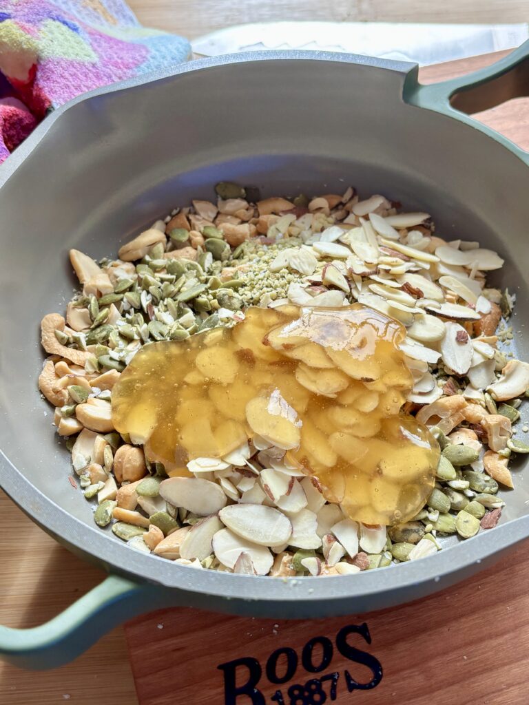 • In a skillet over medium heat, combine the honey, chopped cashews, sliced almonds, chopped pumpkin seeds, hemp seeds, and a pinch of salt. Cook, stirring frequently, until the honey becomes bubbly and coats the mixture, and the nuts get a little golden brown, about 2–3 minutes.