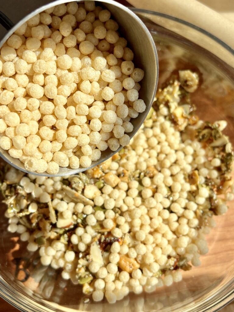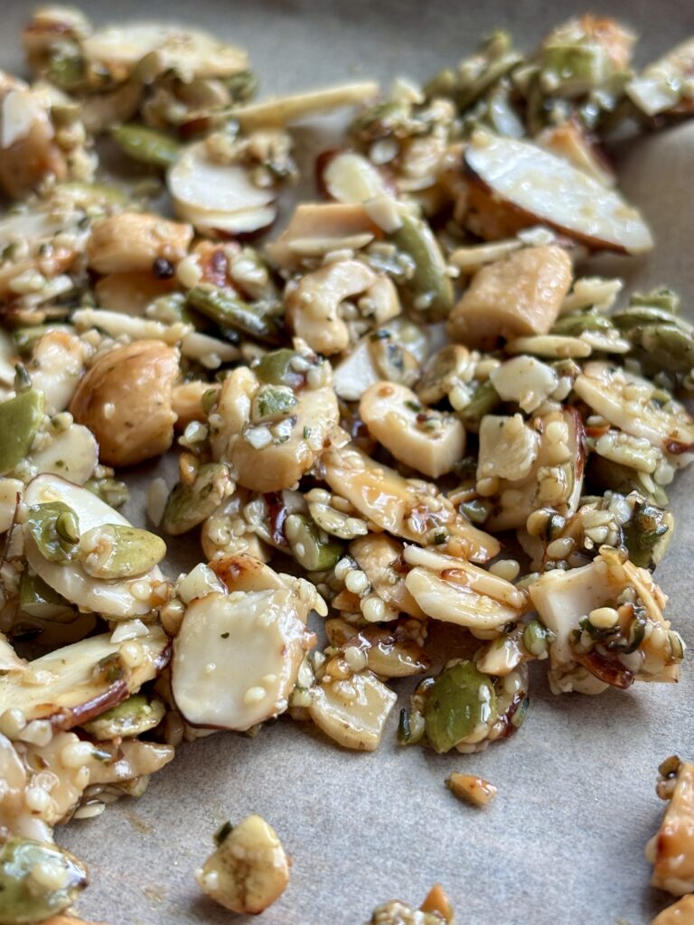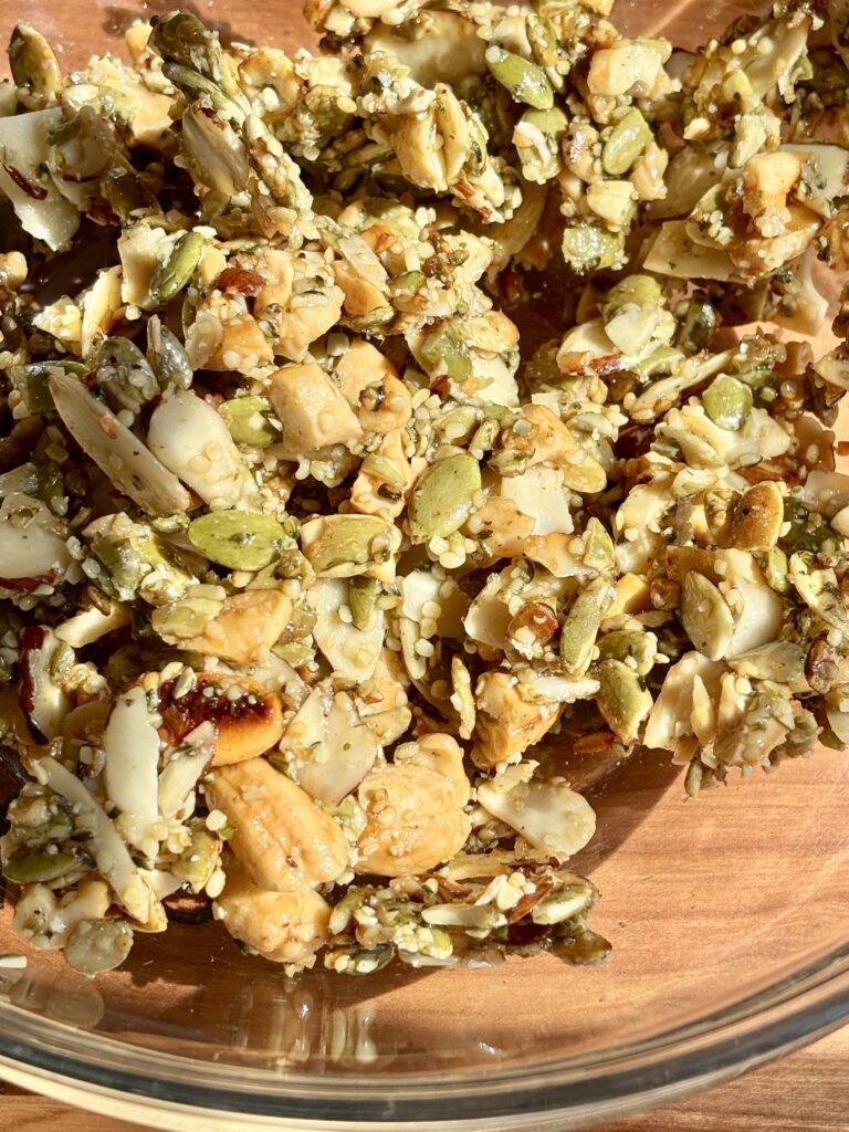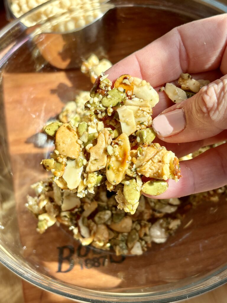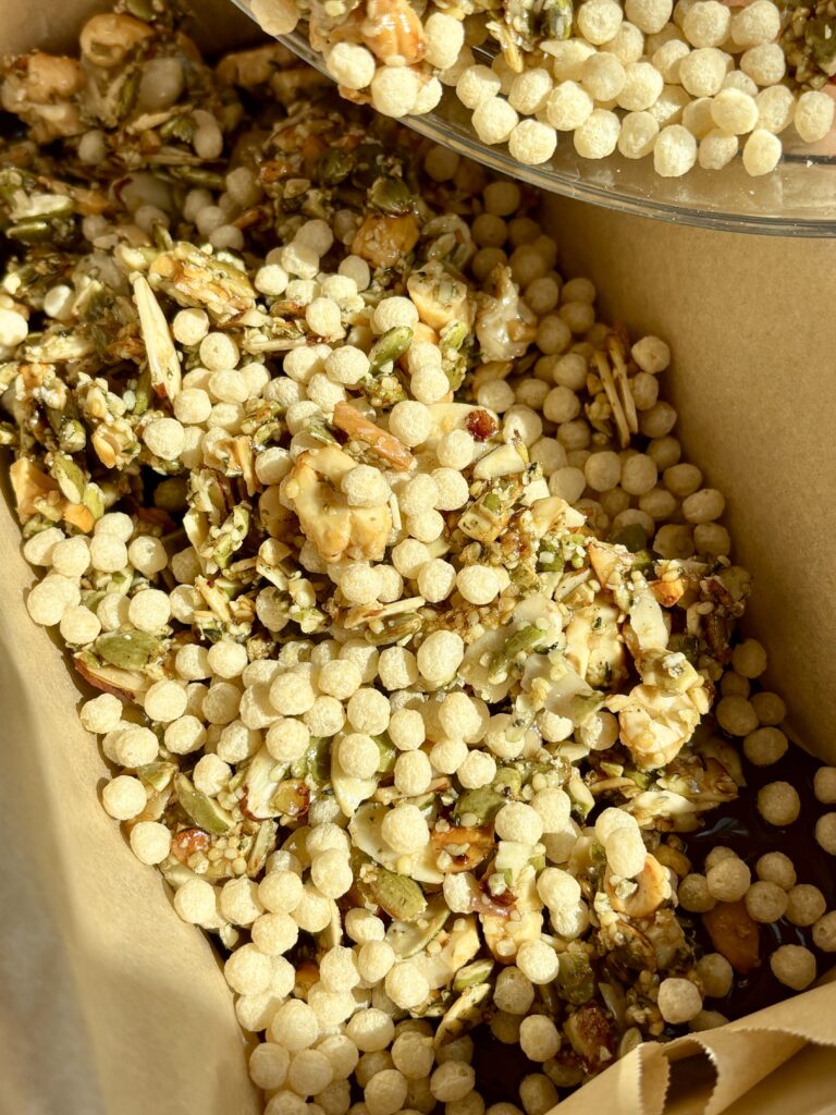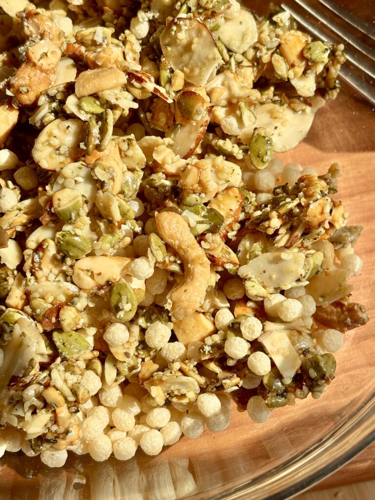 • In a bowl, toss the chopped candied nuts and seeds with the quinoa puffs until evenly combined.