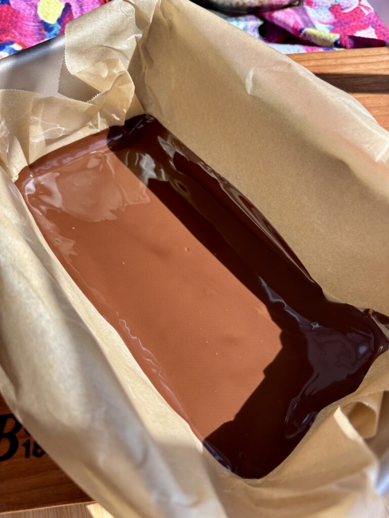 • Press the filling gently but firmly into the base for structurally sound bars and then tap on the counter firmly a few times once adding more melted chocolate to the top so that the chocolate gets in between all the layers.