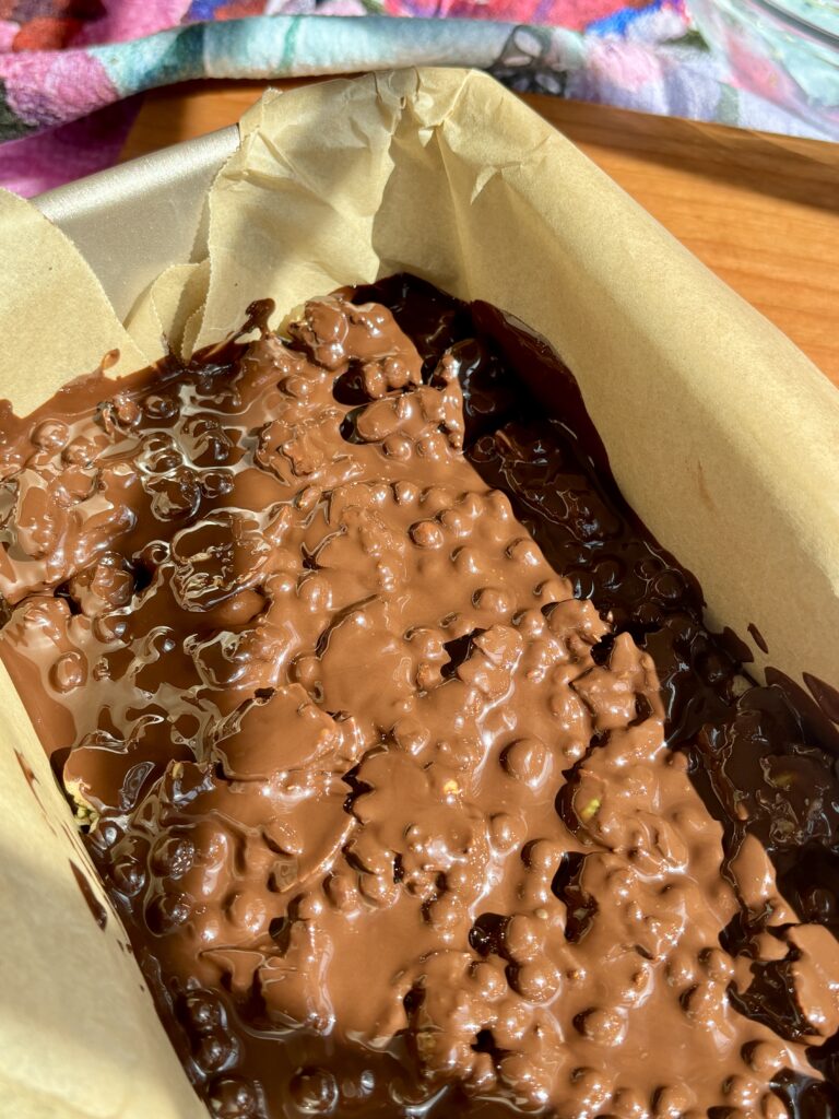 • Pour one quarter of the melted chocolate into the prepared loaf pan and spread evenly on the bottom. Add the quinoa puff mixture, gently pressing it into the chocolate layer.