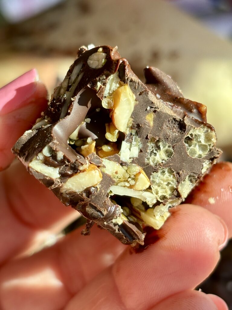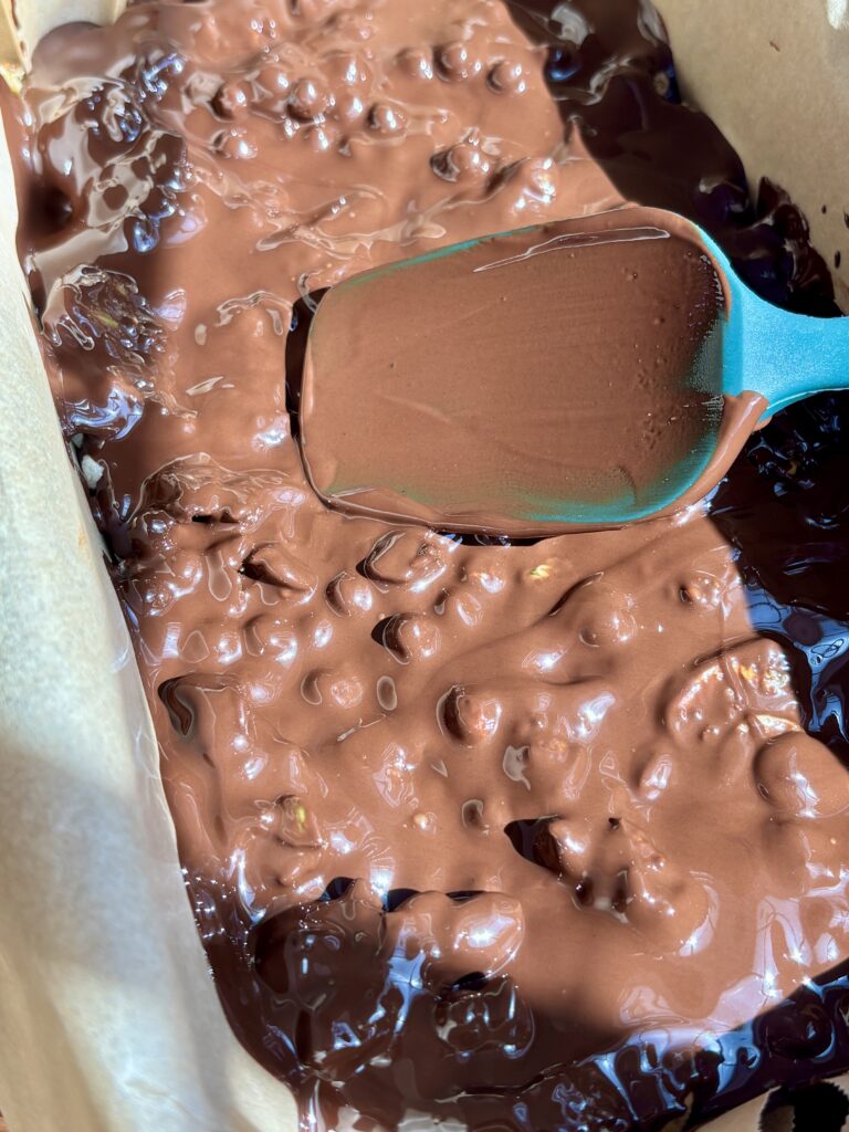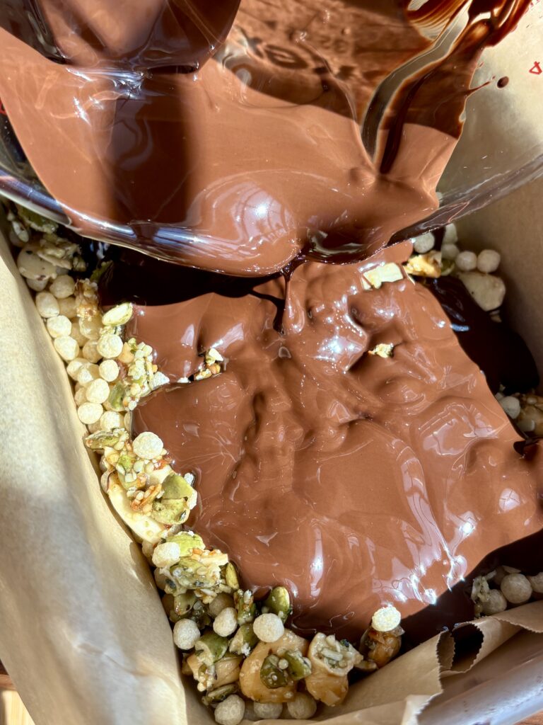 • Pour the remaining chocolate over the filling, spreading it evenly to fully coat. Then firmly bang on the counter a few times to help the chocolate coat all the nuts and seeds.