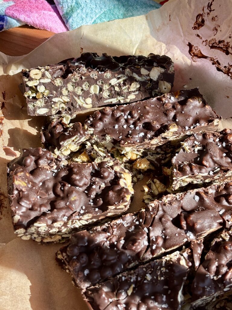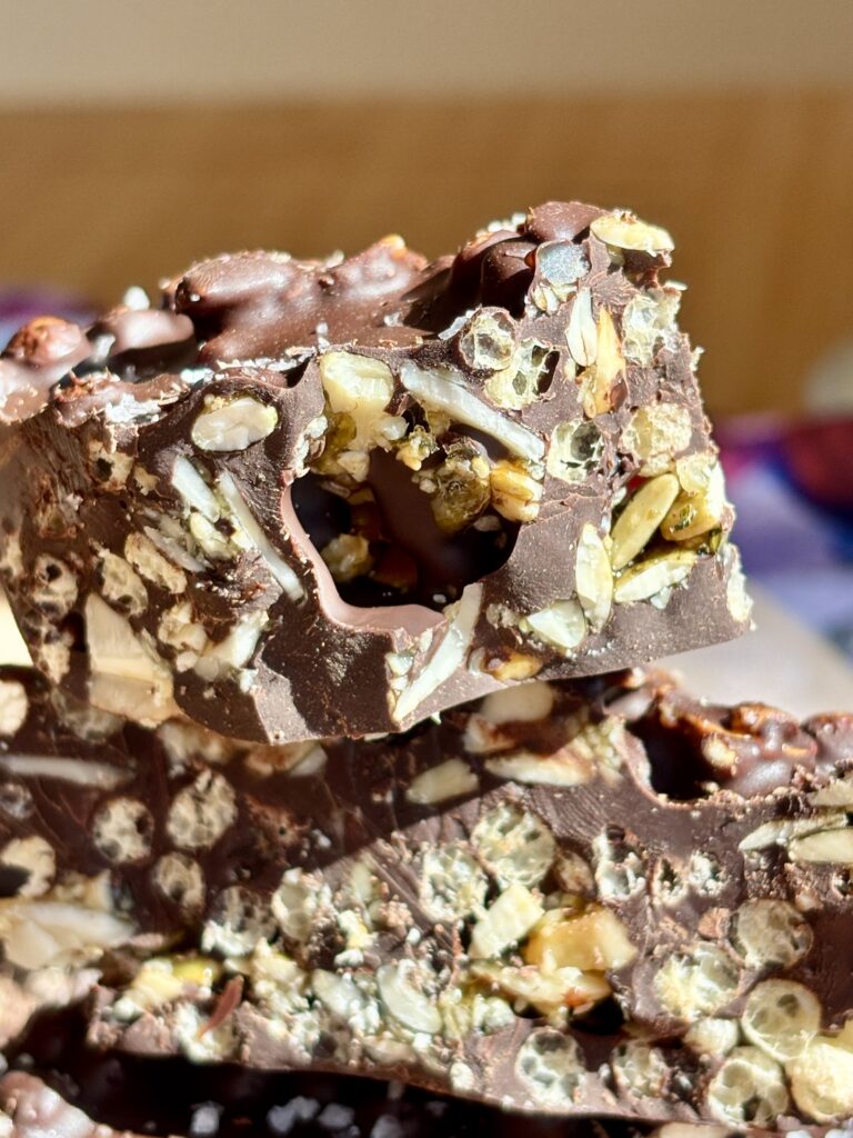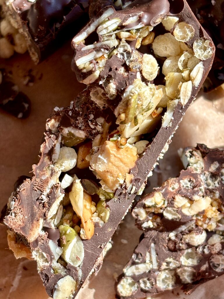 Keyword: chocolate crunch bar, chocolate nut bars, crispy quinoa bars, crispy quinoa chocolate bars, crunchy chocolate bar, no bake chocolate crunch bars, nut and seed bar, nutritious nut bar