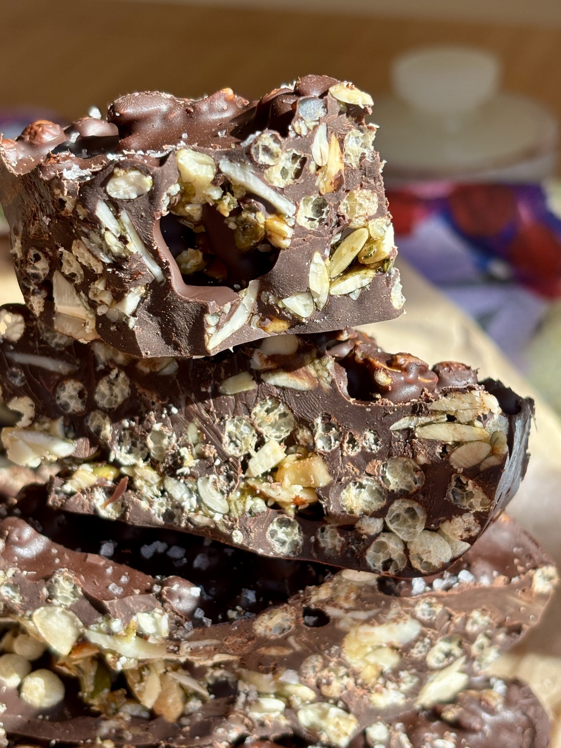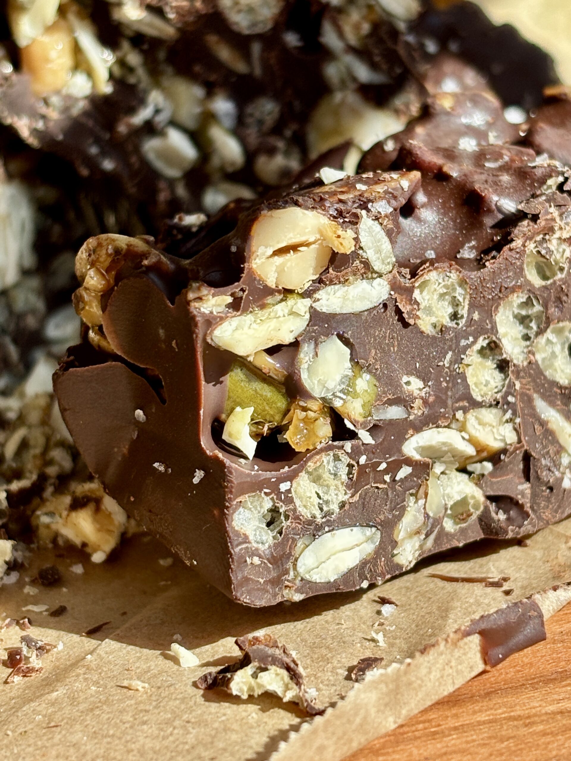 Made with airy quinoa puffs, honey-candied nuts and seeds, and silky dark chocolate, creating a snack that delivers a satisfying crunch in every bite. A sprinkle of flaky sea salt enhances the deep chocolate flavor, while the hemp seeds provide a subtle boost of protein. The result is a snack that feels decadent, yet energizing! Perfect for satisfying your sweet tooth and powering you through your day.