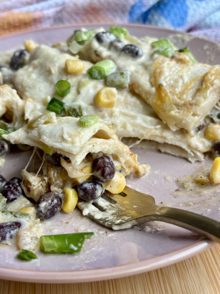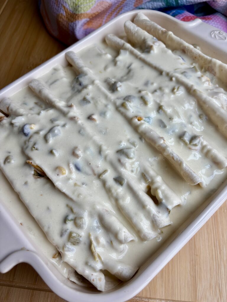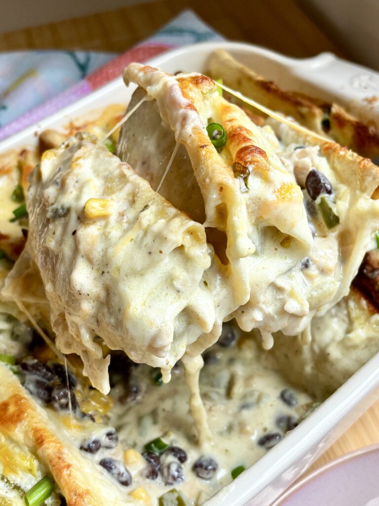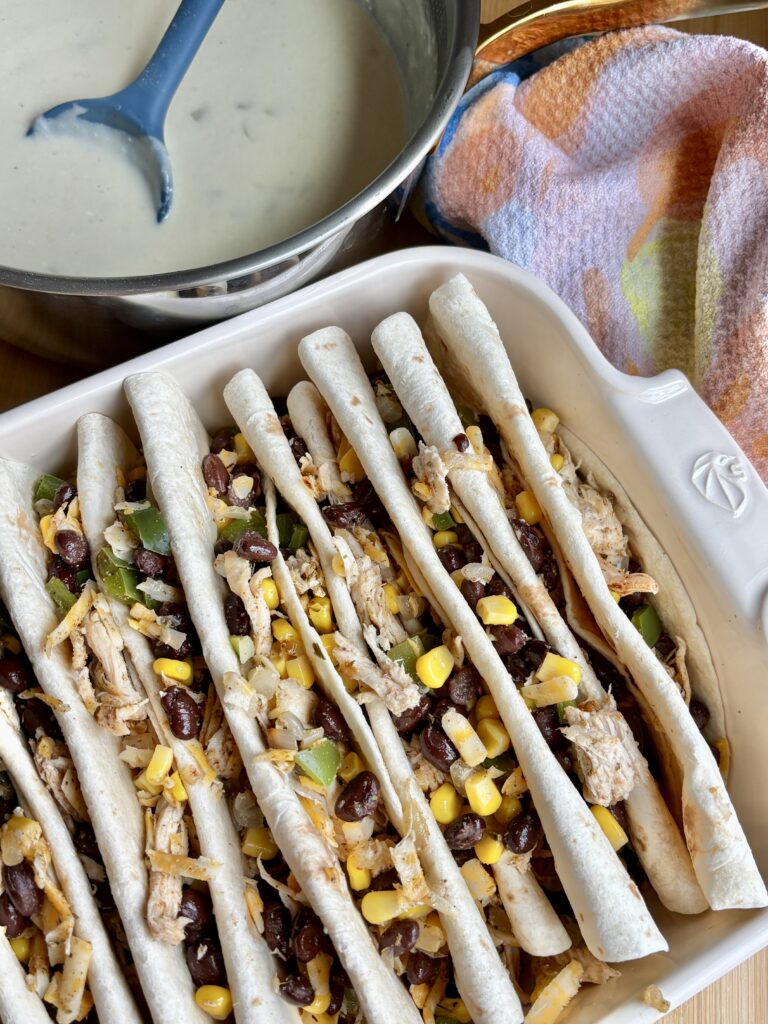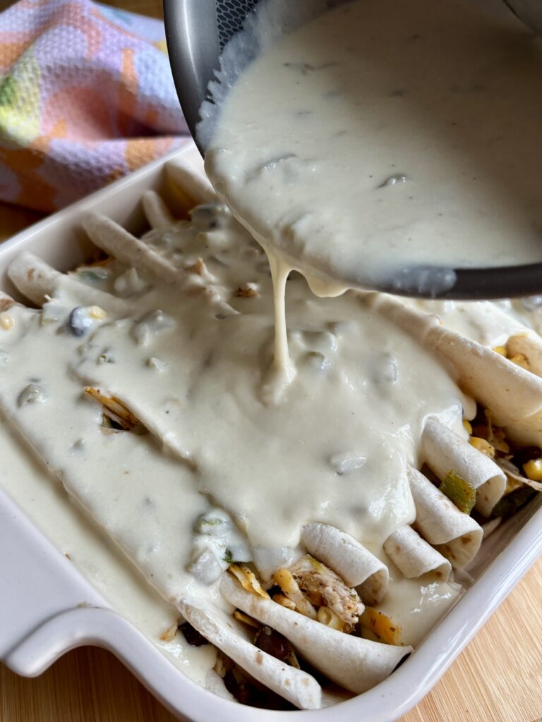The filling is packed with tender shredded chicken, sautéed peppers and onions, black beans, and corn, all seasoned with warm spices. Then everything is smothered in a rich, creamy white enchilada sauce made from scratch with butter, cream, chicken broth, green chiles, and melted Monterey Jack cheese.