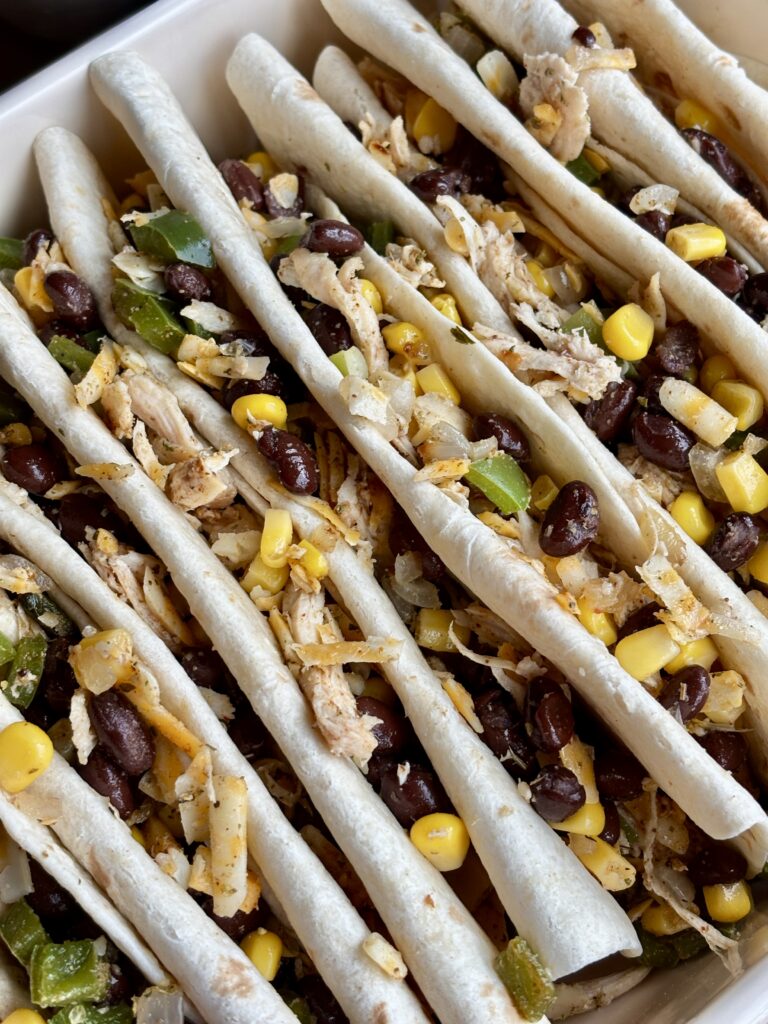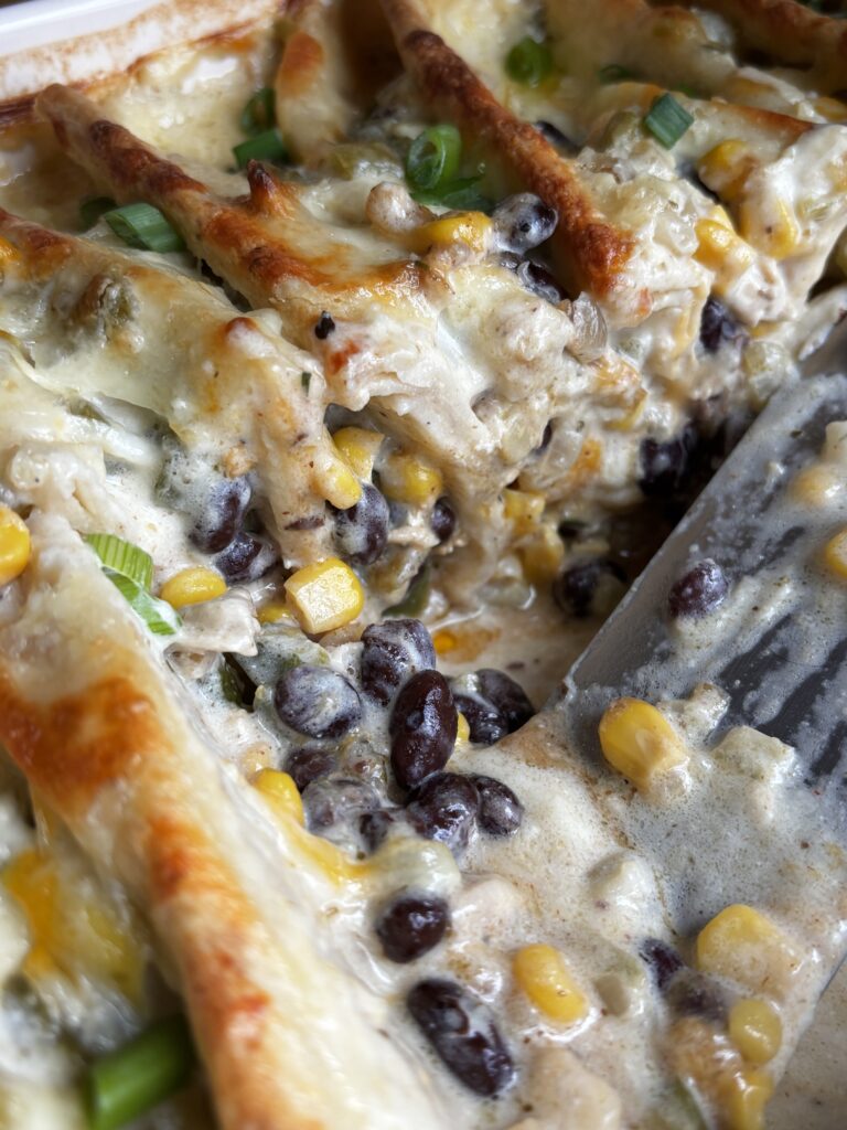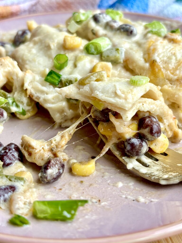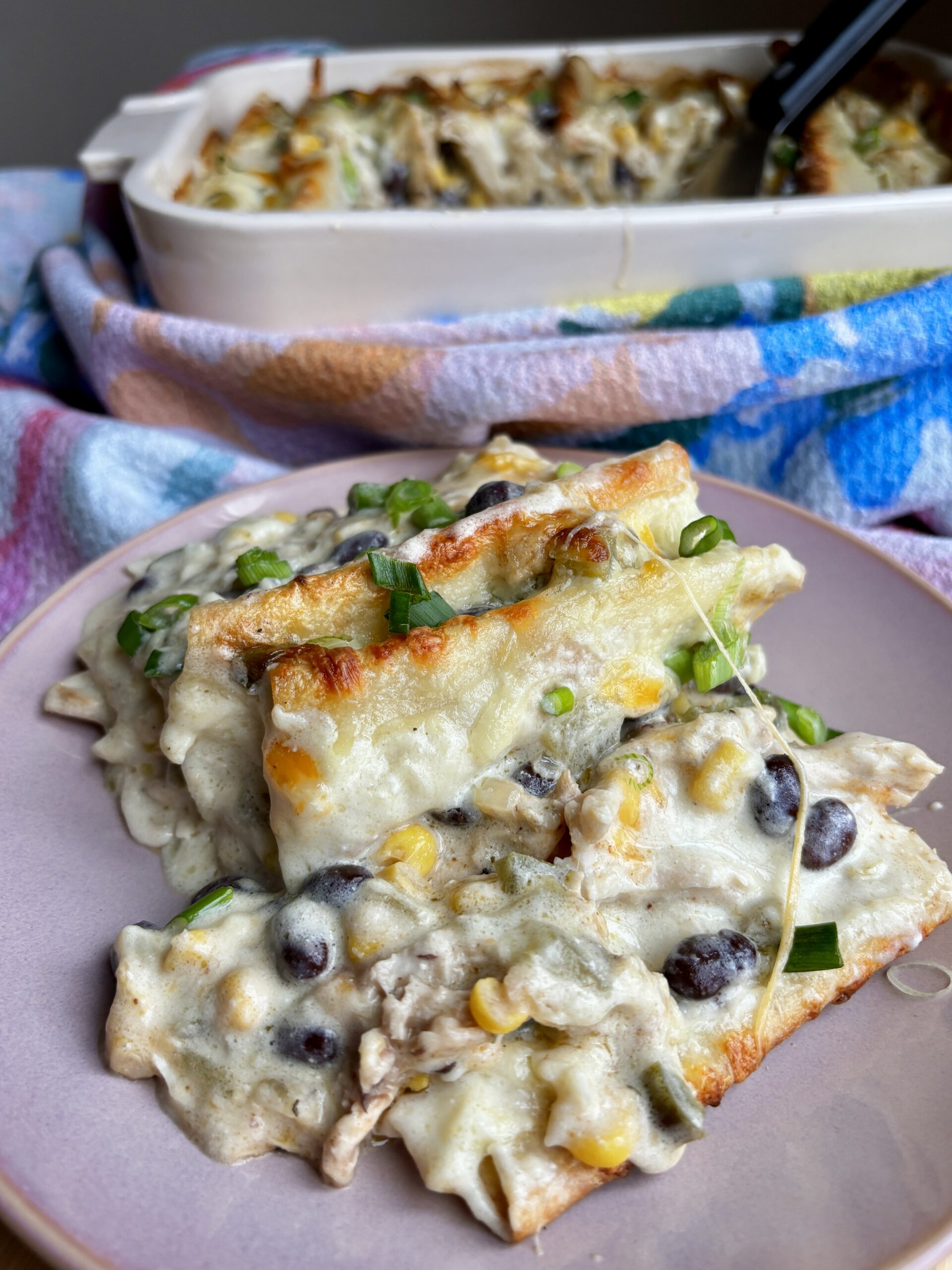 The filling is packed with tender shredded chicken, sautéed peppers and onions, black beans, and corn, all seasoned with warm spices. Then everything is smothered in a rich, creamy white enchilada sauce made from scratch with butter, cream, chicken broth, green chiles, and melted Monterey Jack cheese.