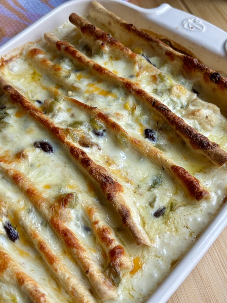 Easy Chicken Enchiladas | White Chicken Enchiladas | Creamy Enchiladas Recipe | Accordion Enchiladas | Chicken Enchiladas with White Chile Sauce | White Sauce Enchiladas | Creamy White Chile Sauce | Easy Weeknight Dinner Recipes | Family Dinner Ideas | Enchiladas with Rotissere Chicken | Mexican Inspired Casserole | Quick Chicken Dinner Recipe