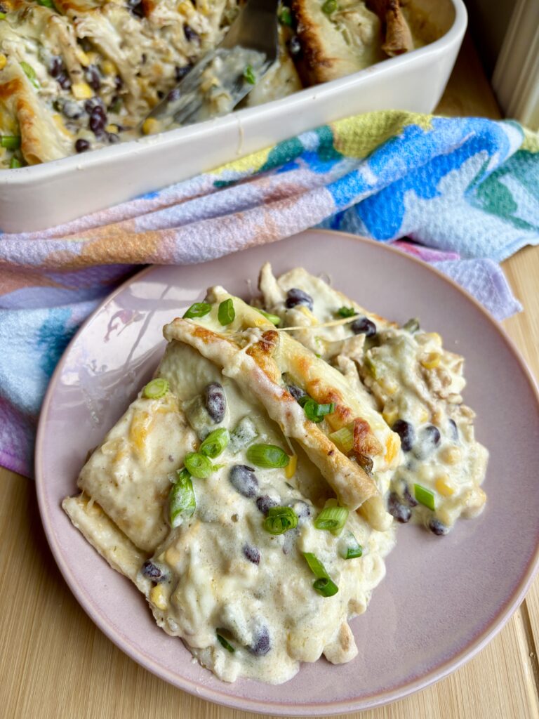 Keyword: chicken enchiladas, easy chicken enchiladas, easy enchiladas, enchilada casserole, white chicken enchiladas, white chile enchiladas