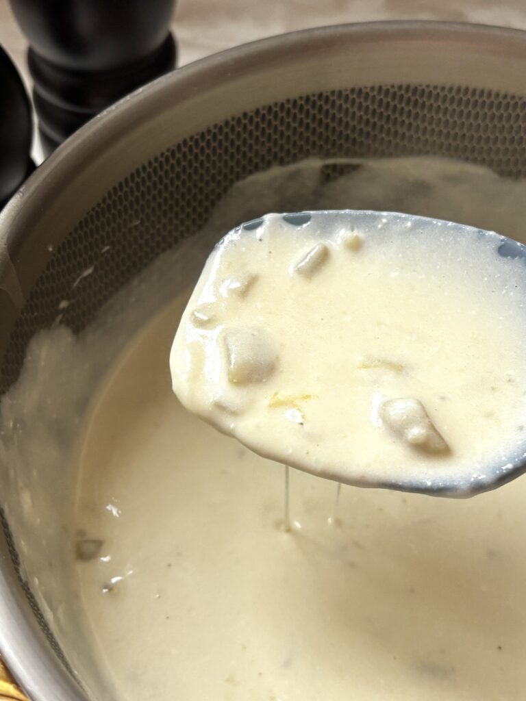 • Gradually whisk in heavy cream and chicken broth until smooth.