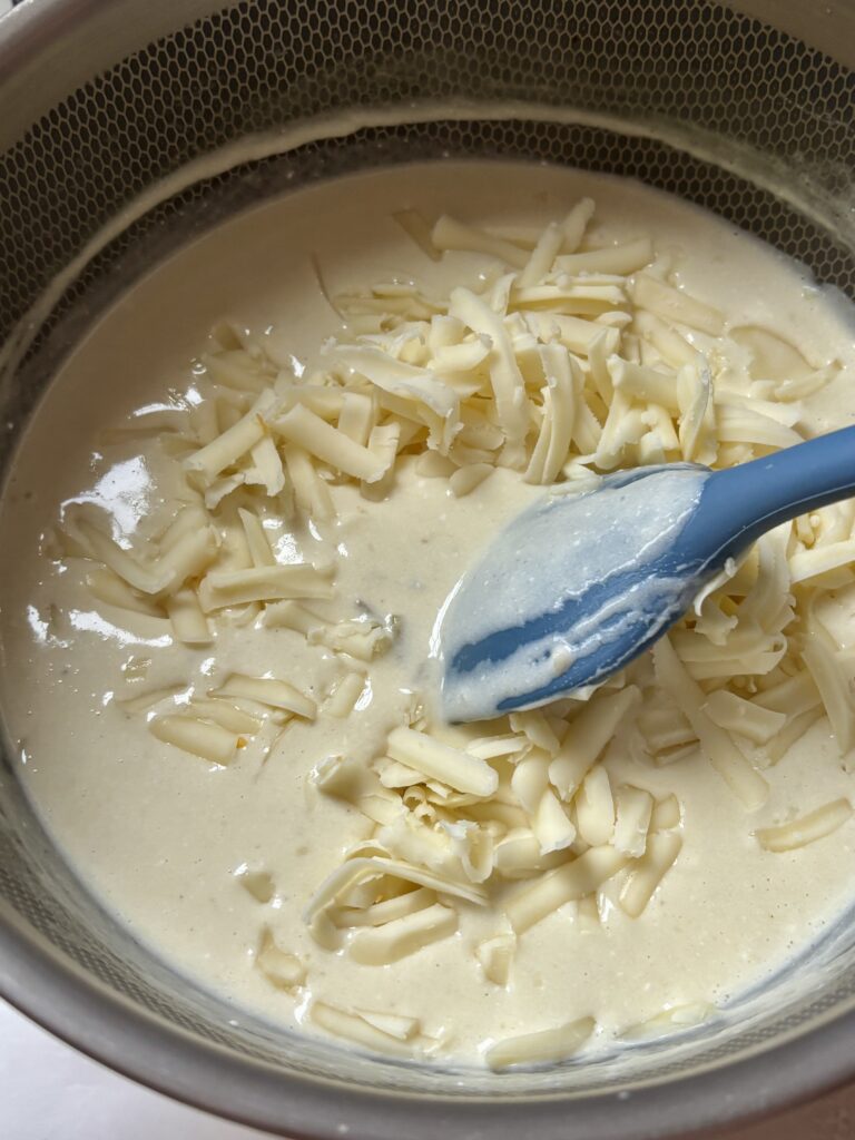 • Remove from heat and mix in ½ cup cheddar cheese.