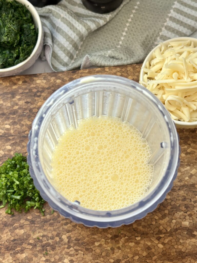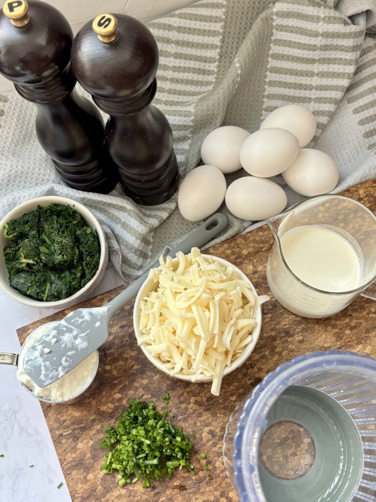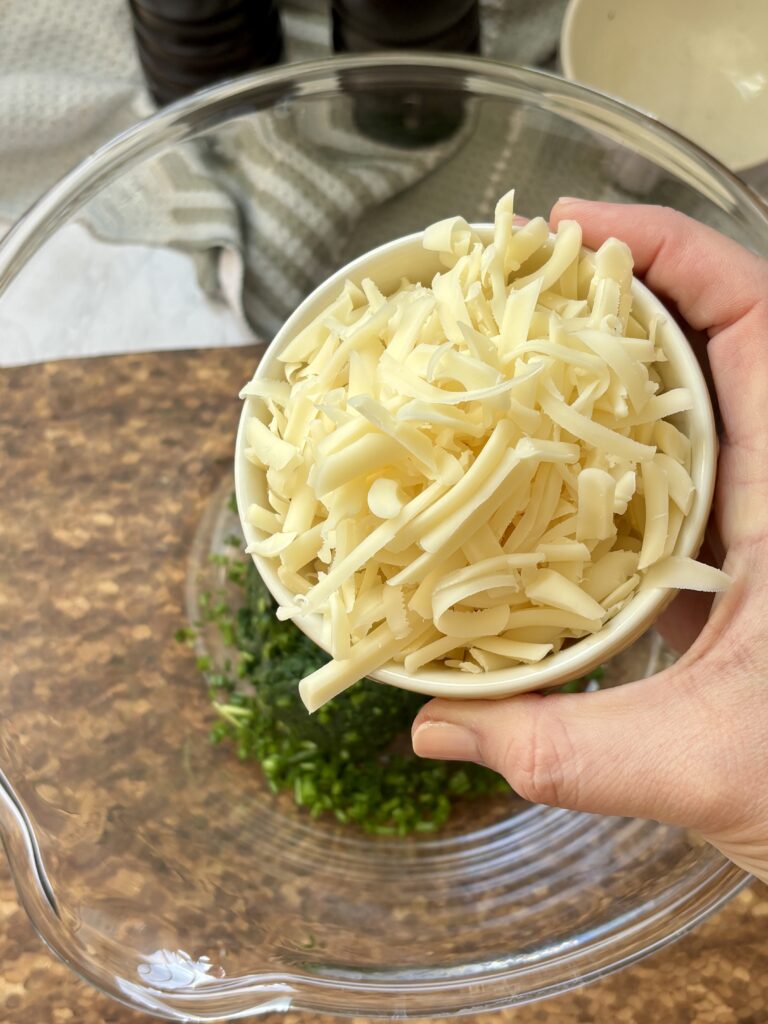 - Add the mix to a large bowl and fold in spinach, shredded cheese, and chives.
