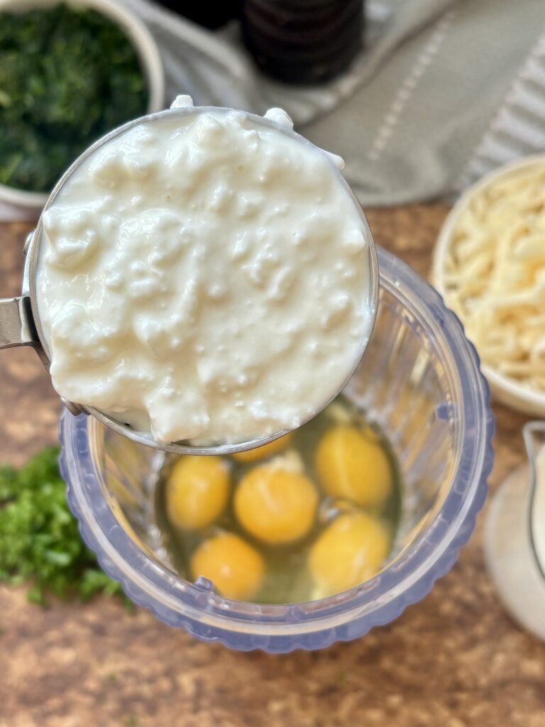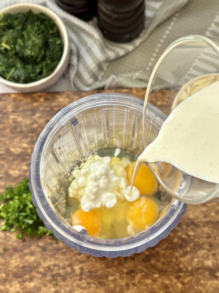 - In a blender combine eggs, cottage cheese, milk, garlic powder, paprika, salt, and pepper. Blend until smooth.