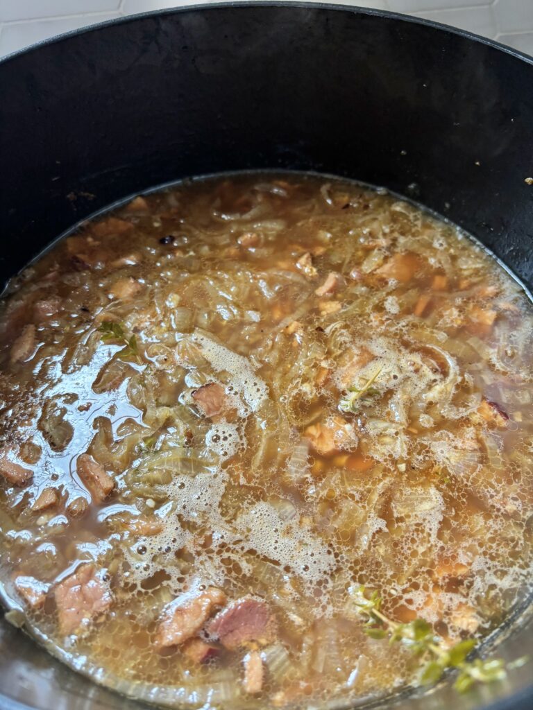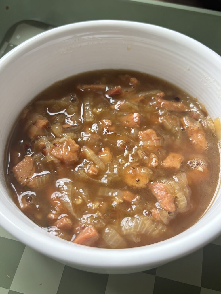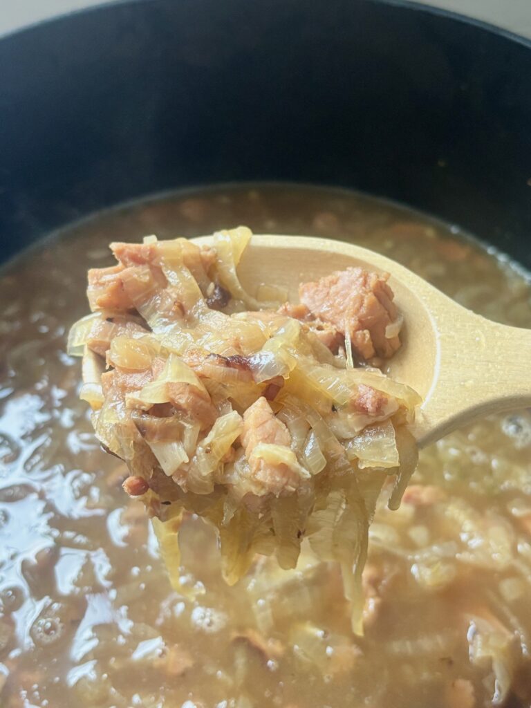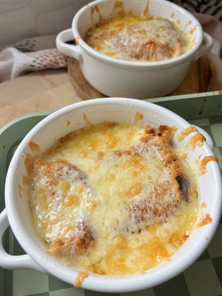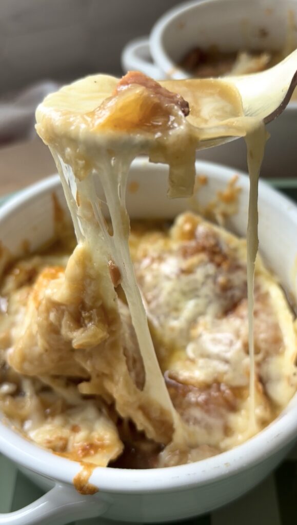 Sweet caramelized onions, savory beef broth, tender bites of smoky ham, and gooey melted Gruyère come together under a crisp, golden puff pastry topper that replaces traditional bread for a flaky, buttery upgrade. The apple juice deglaze brings gentle sweetness, while thyme, garlic, and Worcestershire deepen the flavor into a rich, restaurant-style soup.