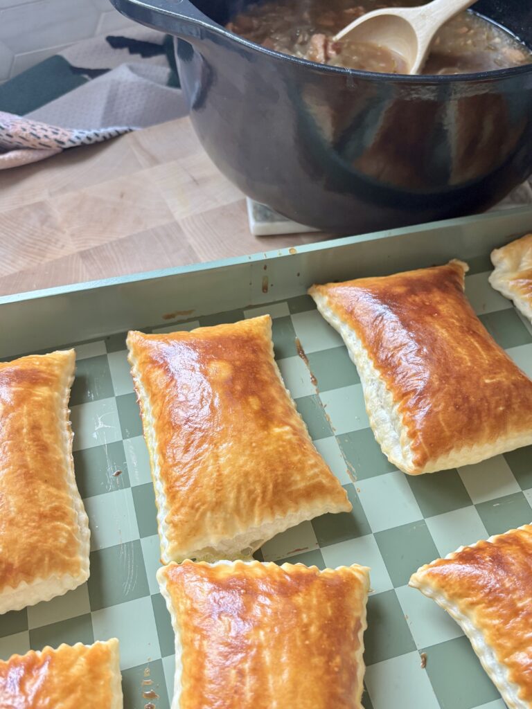- While soup is simmering, preheat oven to 400°F (200°C). Unfold the puff pastry onto a lightly floured surface. Cut into 8 equal rectangles (or larger rounds if you prefer a dramatic look).