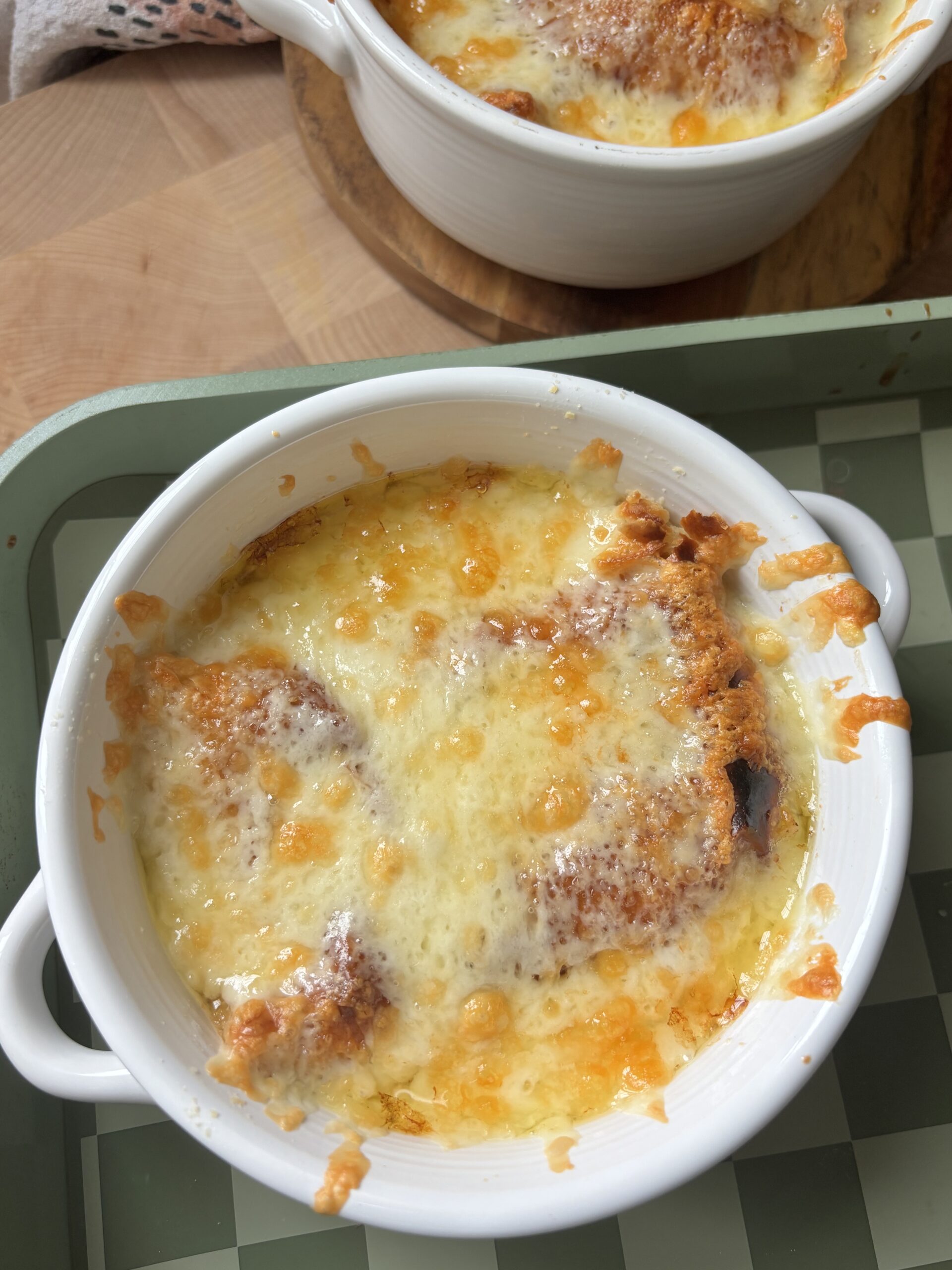 - Once the soup and puff pastry is done, preheat the broiler to high and ladle hot soup into oven-safe bowls. Add a puff pastry to each bowl, letting them soak slightly. Top with a generous handful of the cheddar–Gruyère mixture. Broil for 2–3 minutes, until the cheese is melted, bubbling, and golden brown.