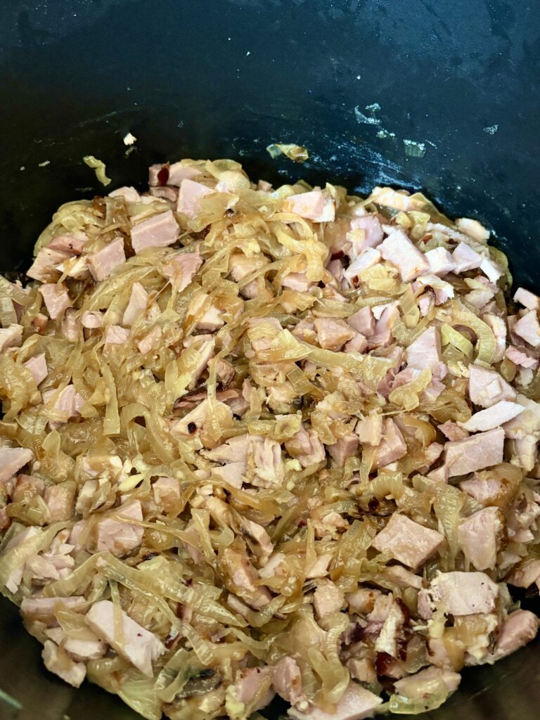 - Add garlic and diced ham; cook 1-2 minutes. Pour in juice and scrape up browned bits from the bottom. Simmer until mostly evaporated, about 2–3 minutes.