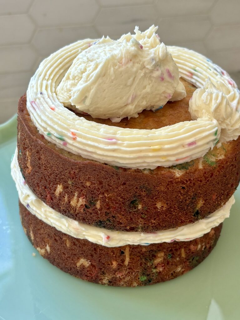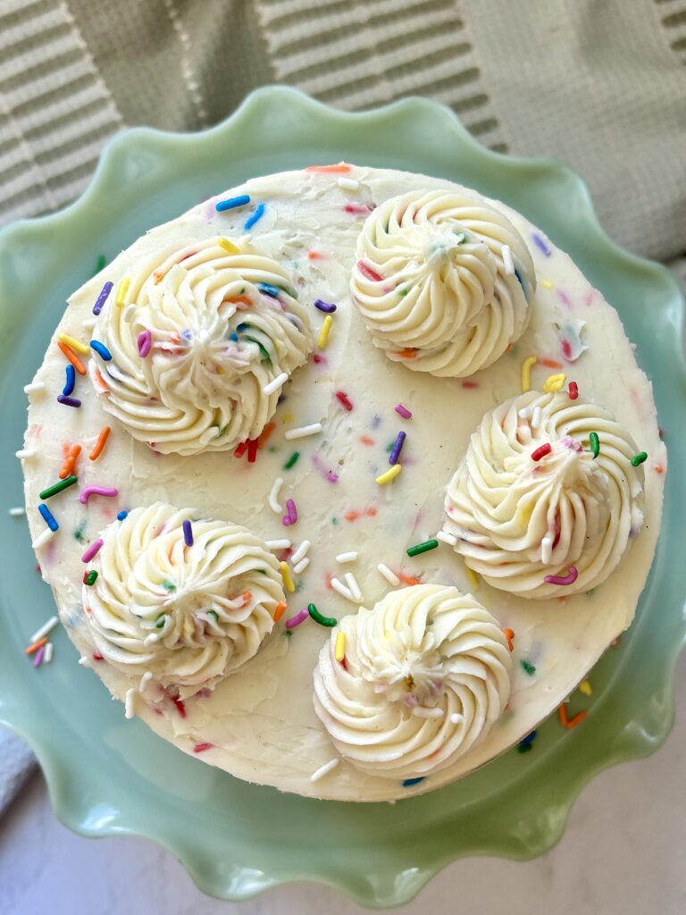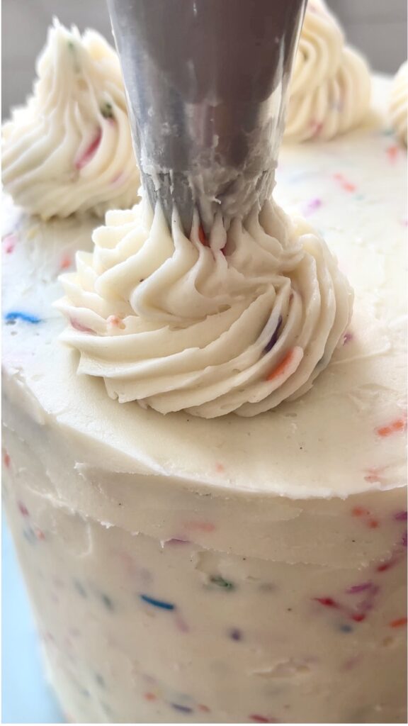 Made with simple ingredients and ready in just 10 minutes, this buttercream is easy to work with, pipes beautifully, and spreads like a dream. The key is whipping the butter until it’s ultra pale and fluffy, then gently folding in the sprinkles at the end to keep the colors bright and defined. It’s nostalgic, joyful, and the perfect finishing touch for any funfetti dessert.